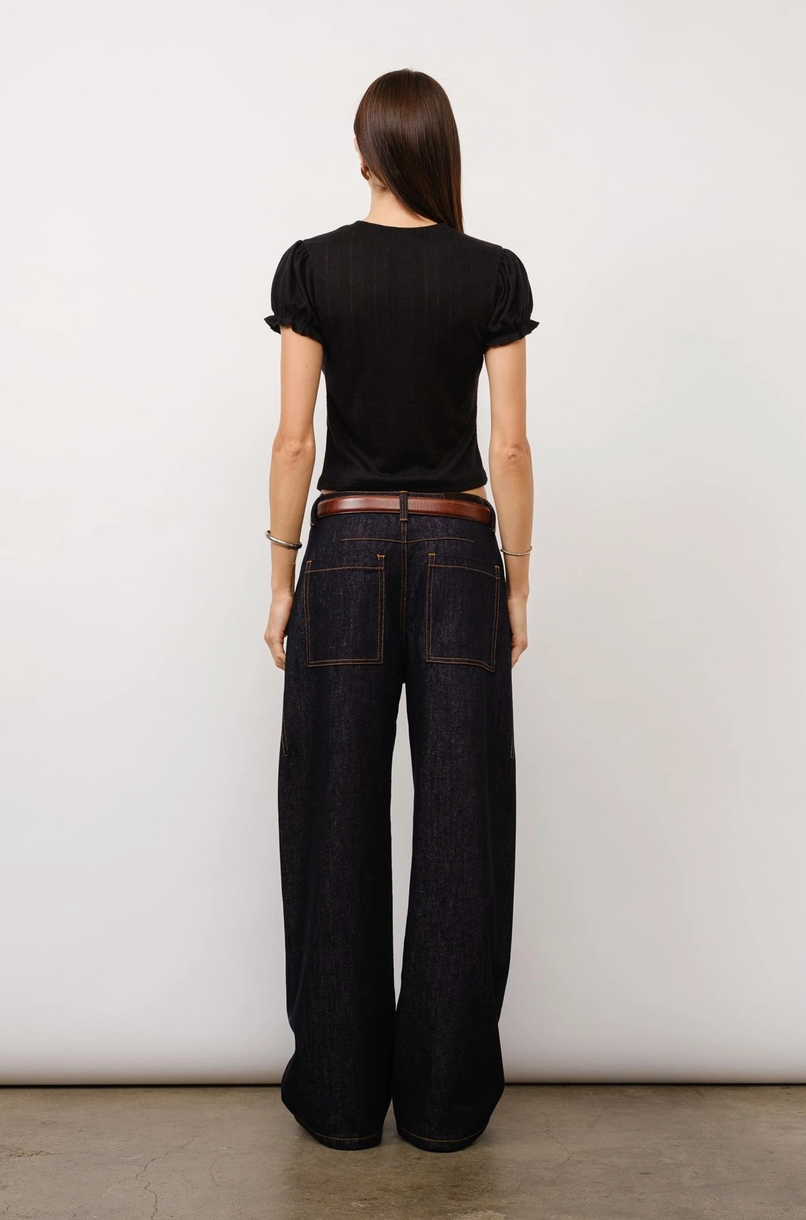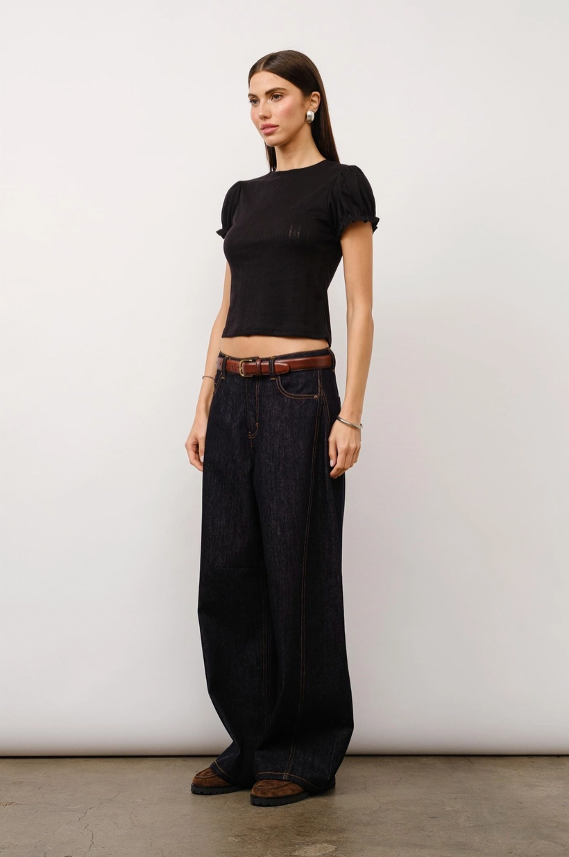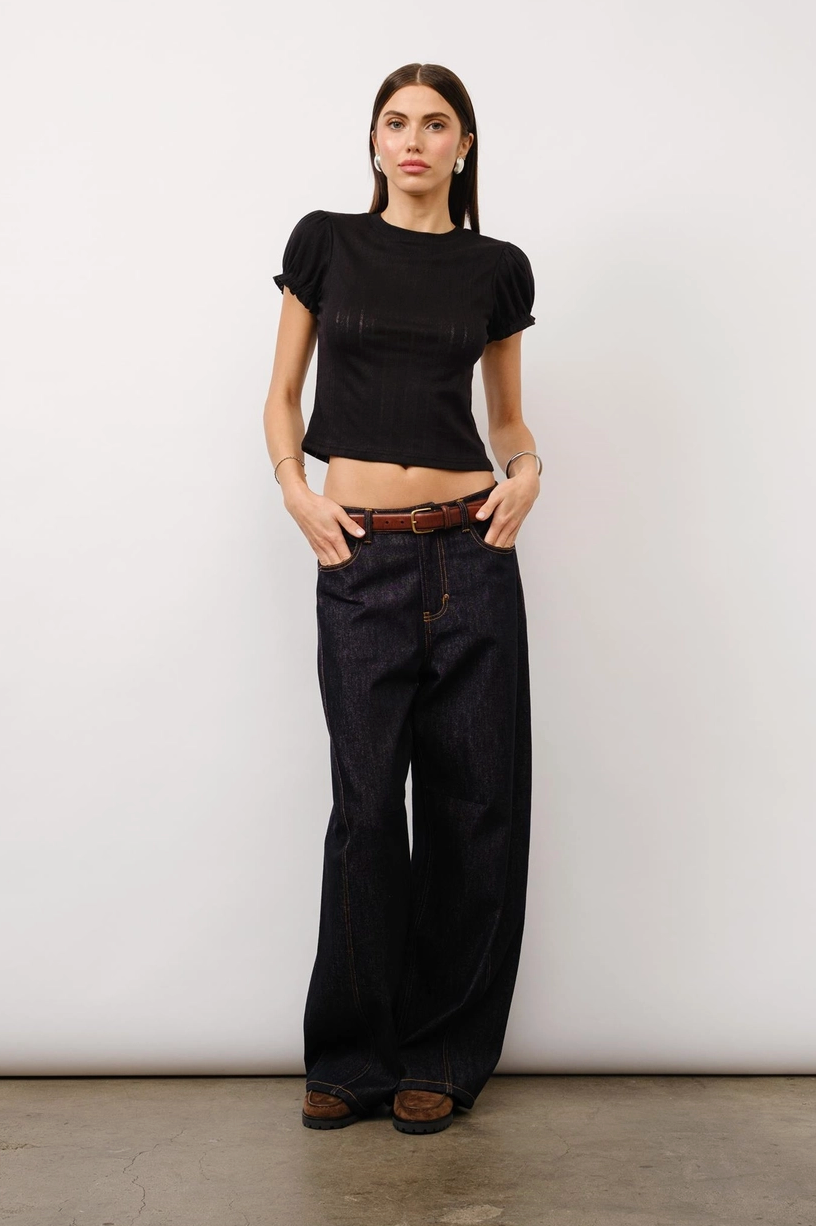 The Clementine top combines vintage charm with modern styling. Crafted in pointelle jersey with sweet puff sleeves and ruffle details, finished with a classic crewneck and relaxed baby tee fit.