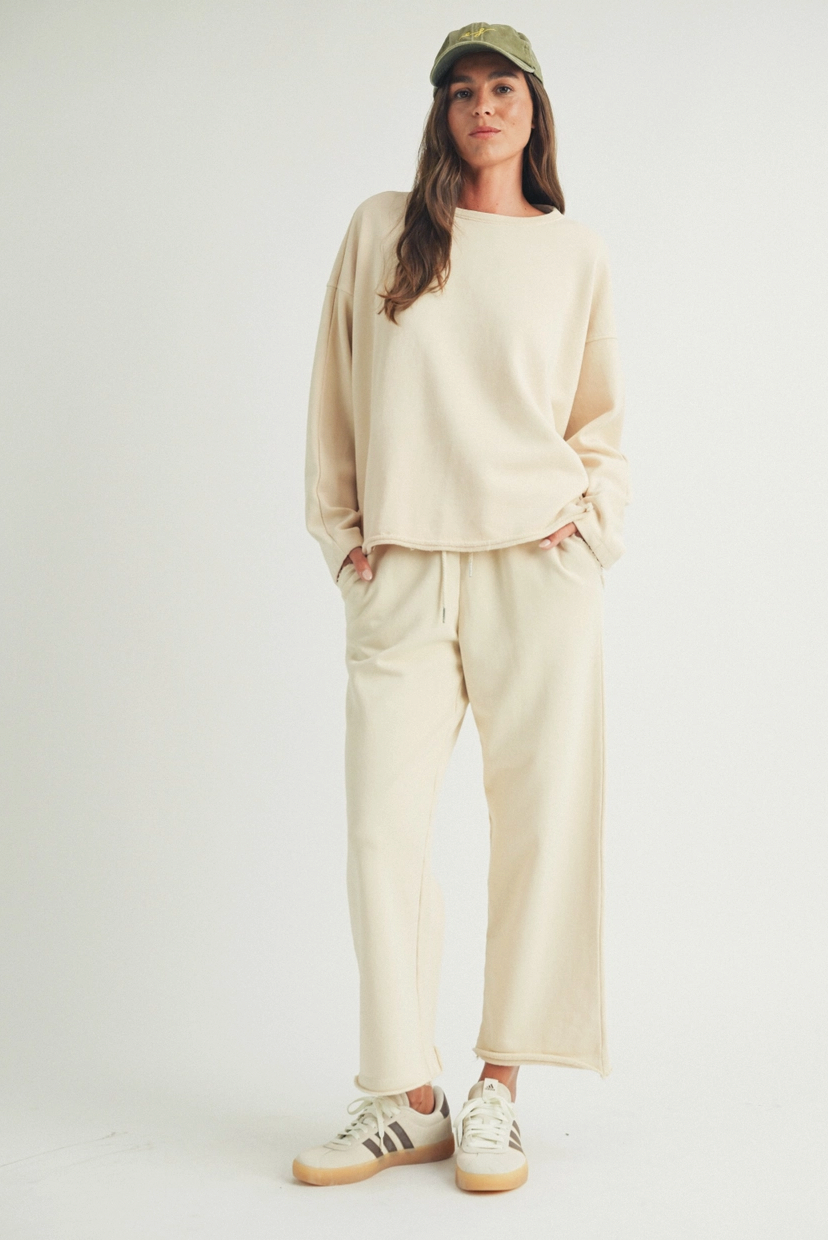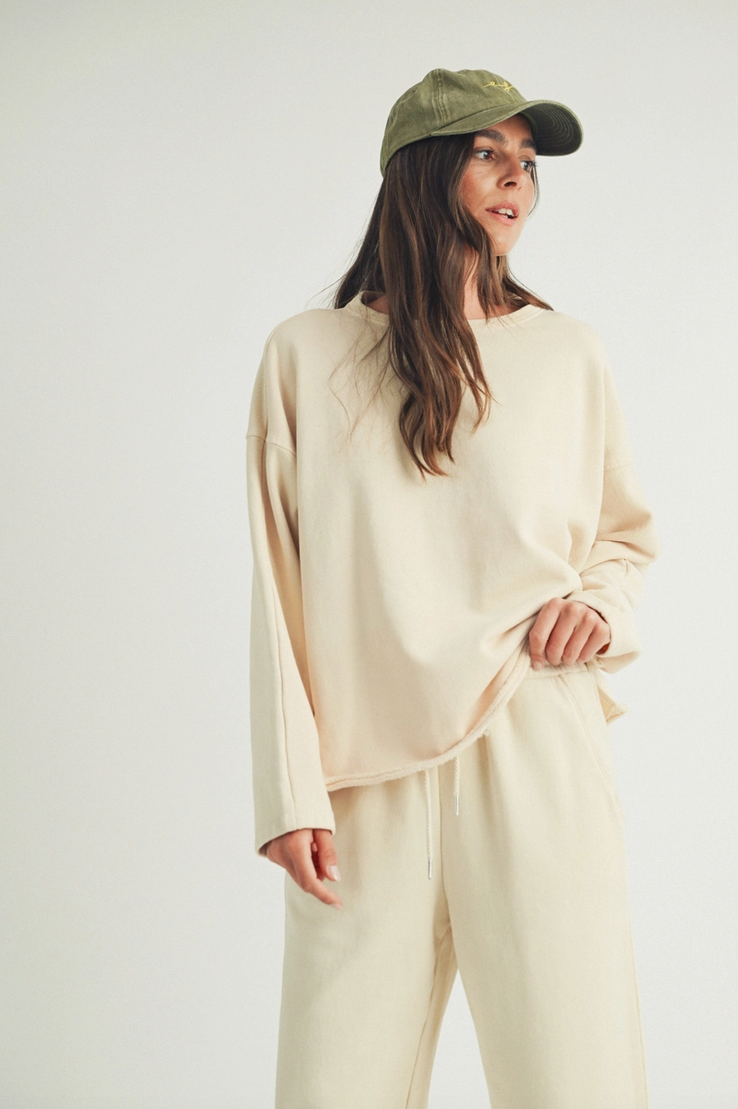 An oversized pullover with relaxed dropped shoulders . We love the soft washed finish that gives a worn-in look and feel. This top features a raw edge hem that adds a touch of casual edge and a rounded high-low hemline for easy layering. Pair with the matching wide leg lounge pants for a cute set.