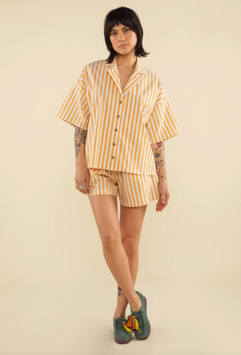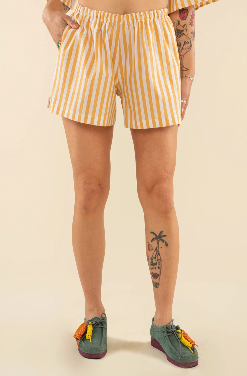 A striped cotton boxer shorts with an elastic waistband, and side pockets. The fabric is a striped cotton spandex in the prettiest yellow color. Pair with your favorite tee and wear all summer.