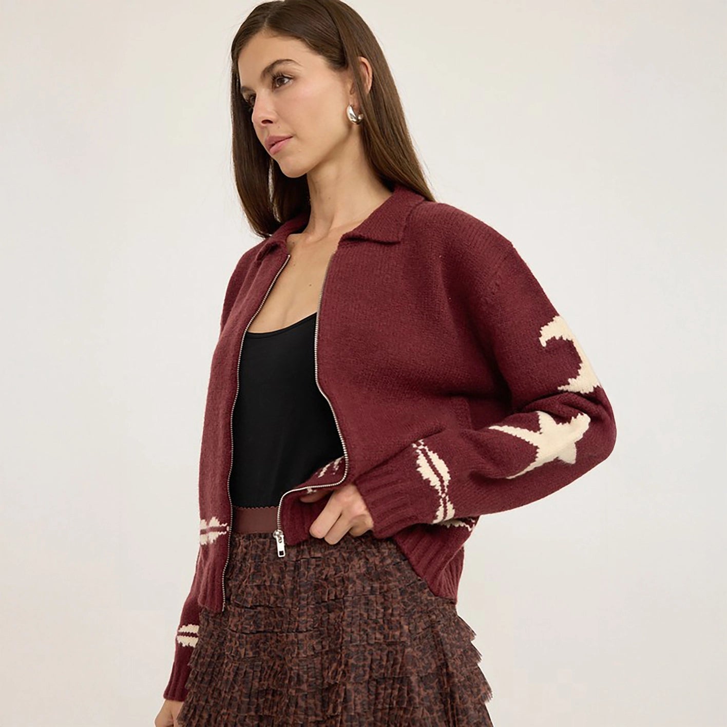 Made from a premium blend of acrylic, nylon, and polyester, this sweater jacket combines comfort, warmth, and statement style.