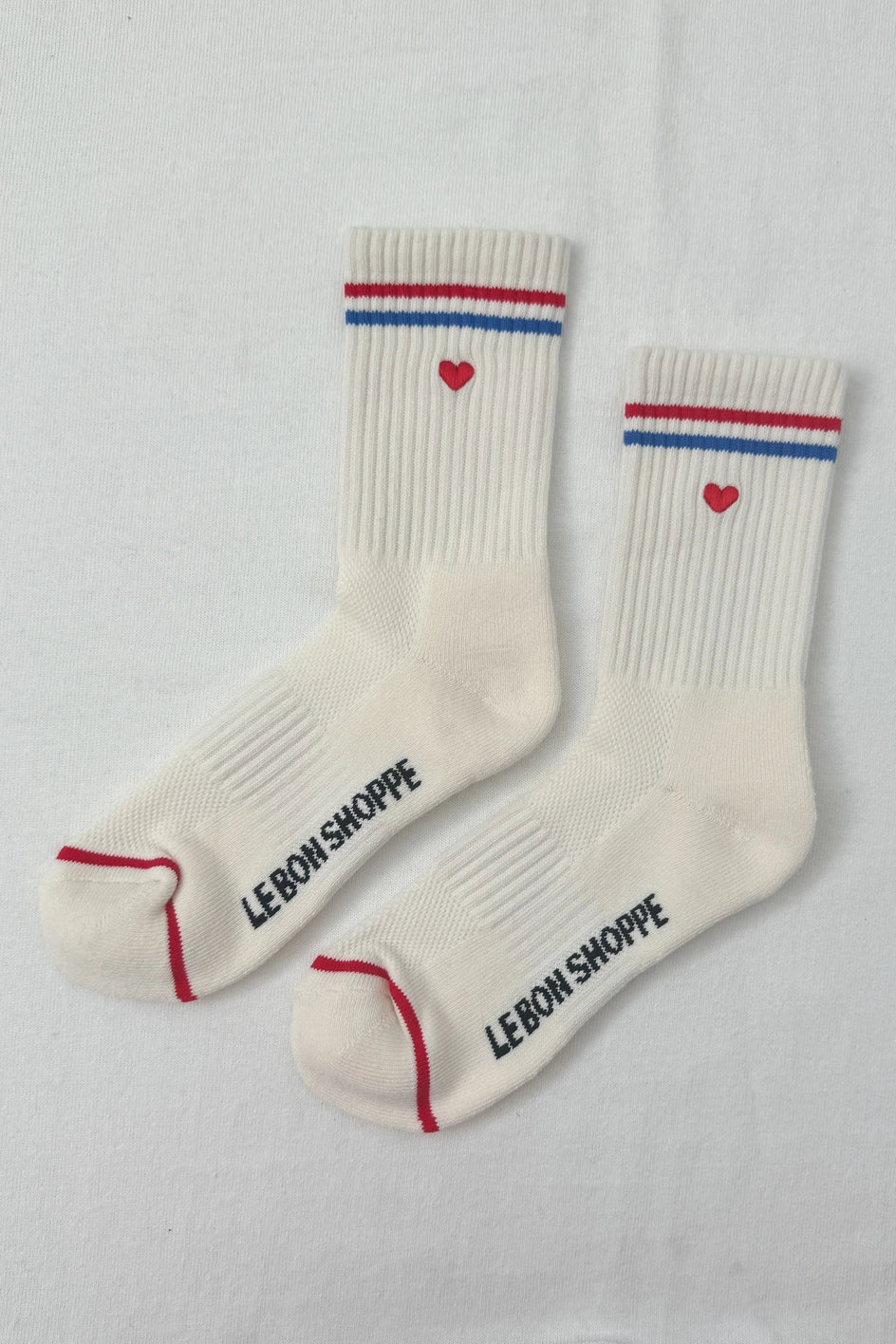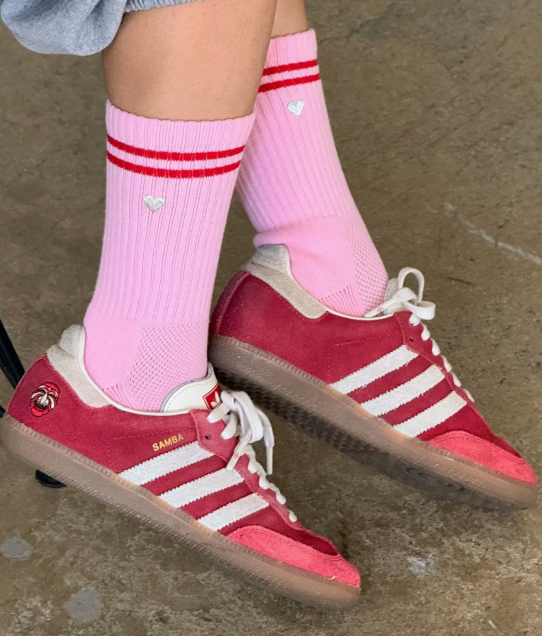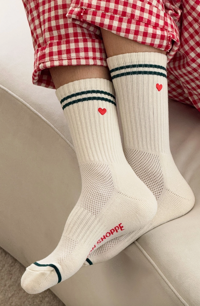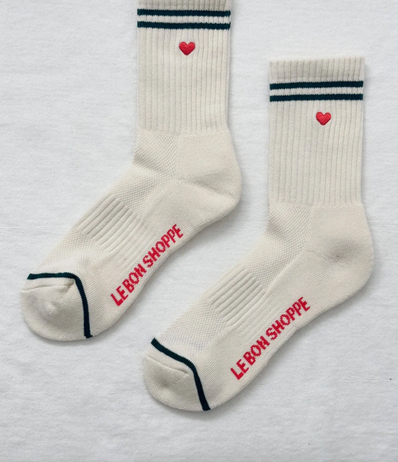 Sporty charm meets playful style when it comes to these socks. They feature a similar structure to the classic Boyfriend and Girlfriend Socks, fun contrasting stripes, and a cheeky embroidered heart. They make the perfect gift without cause and are a sweet addition to any outfit.