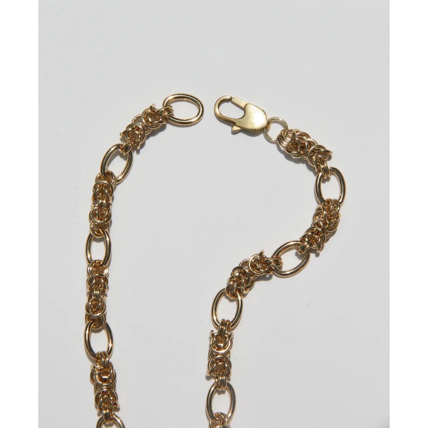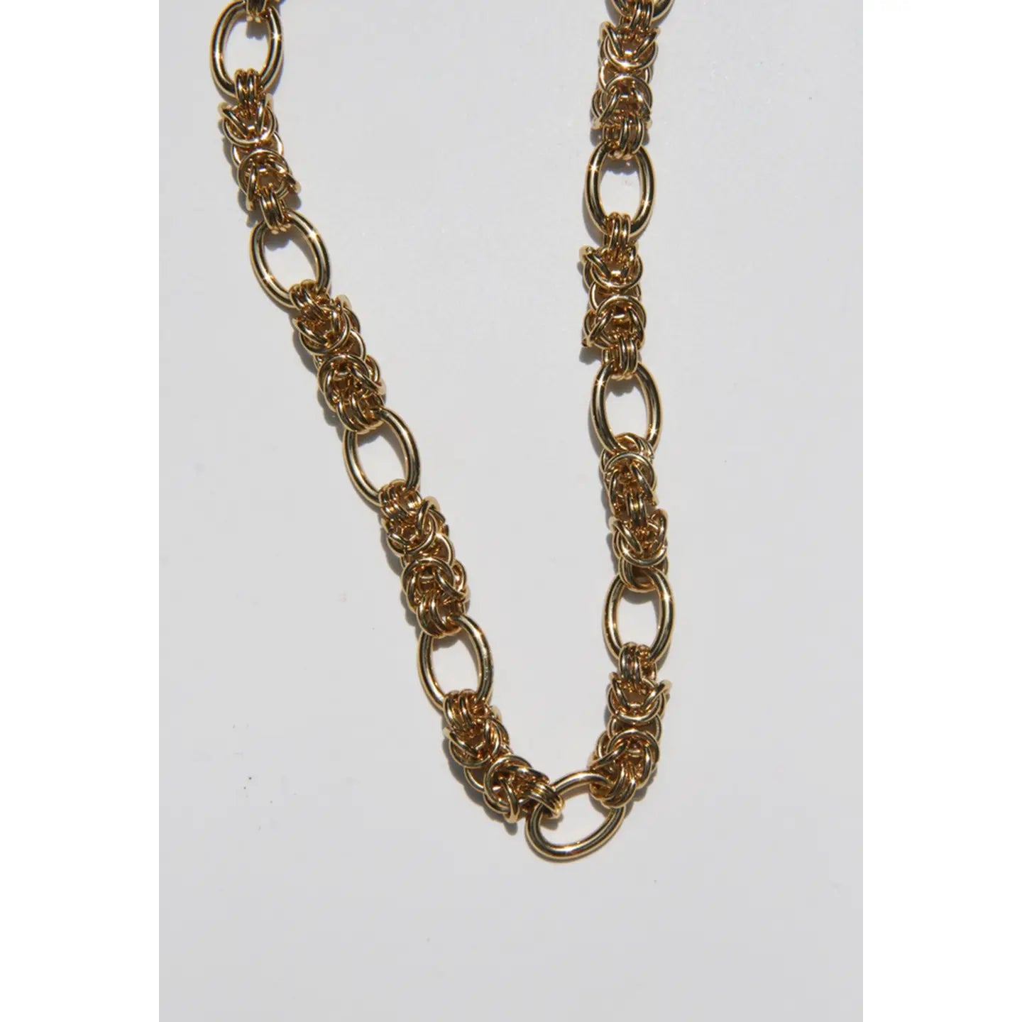 The Florentine Necklace is a byzantine link chain necklace featuring woven links and interspersed oval rings -- creating an airiness that lightens the weight while preserving its bold, intricate look.