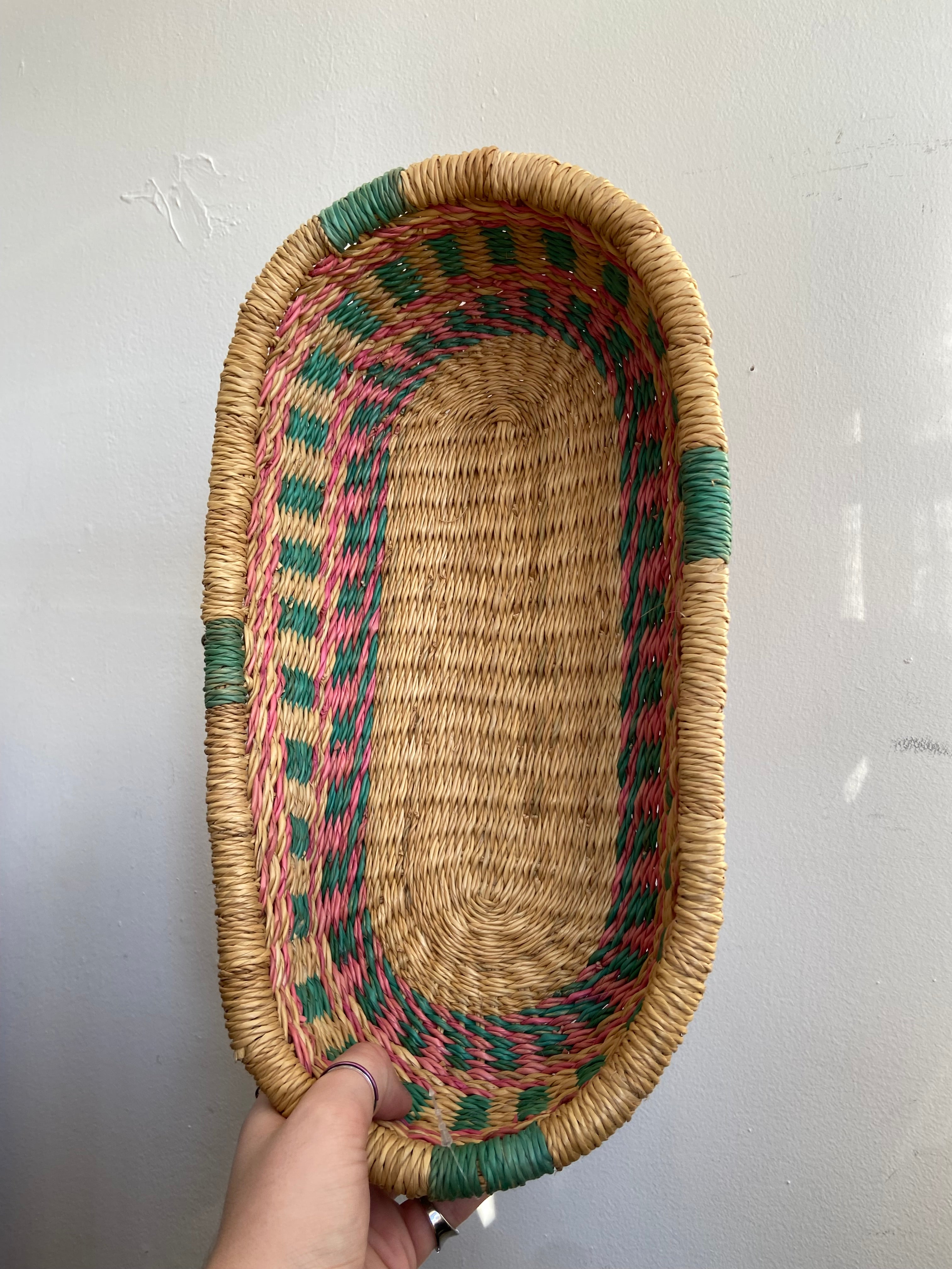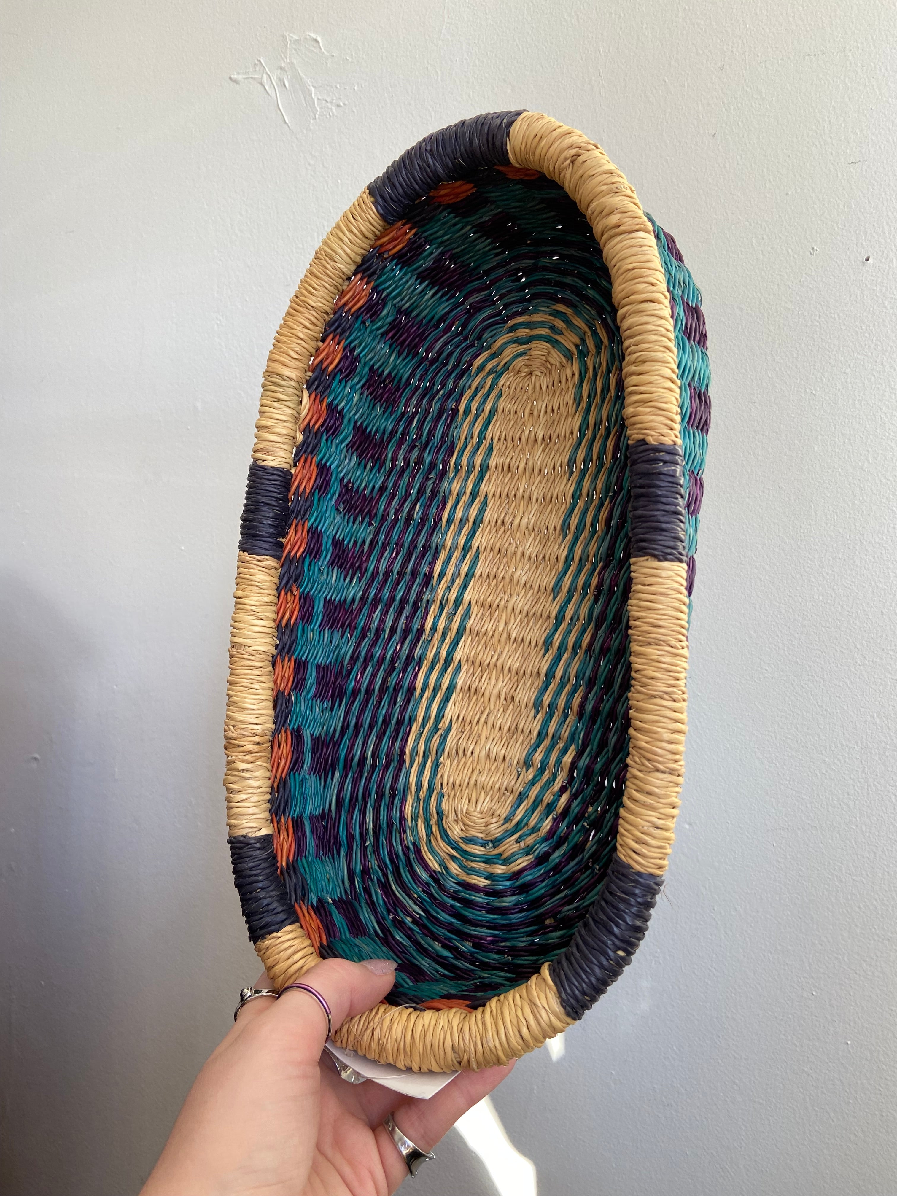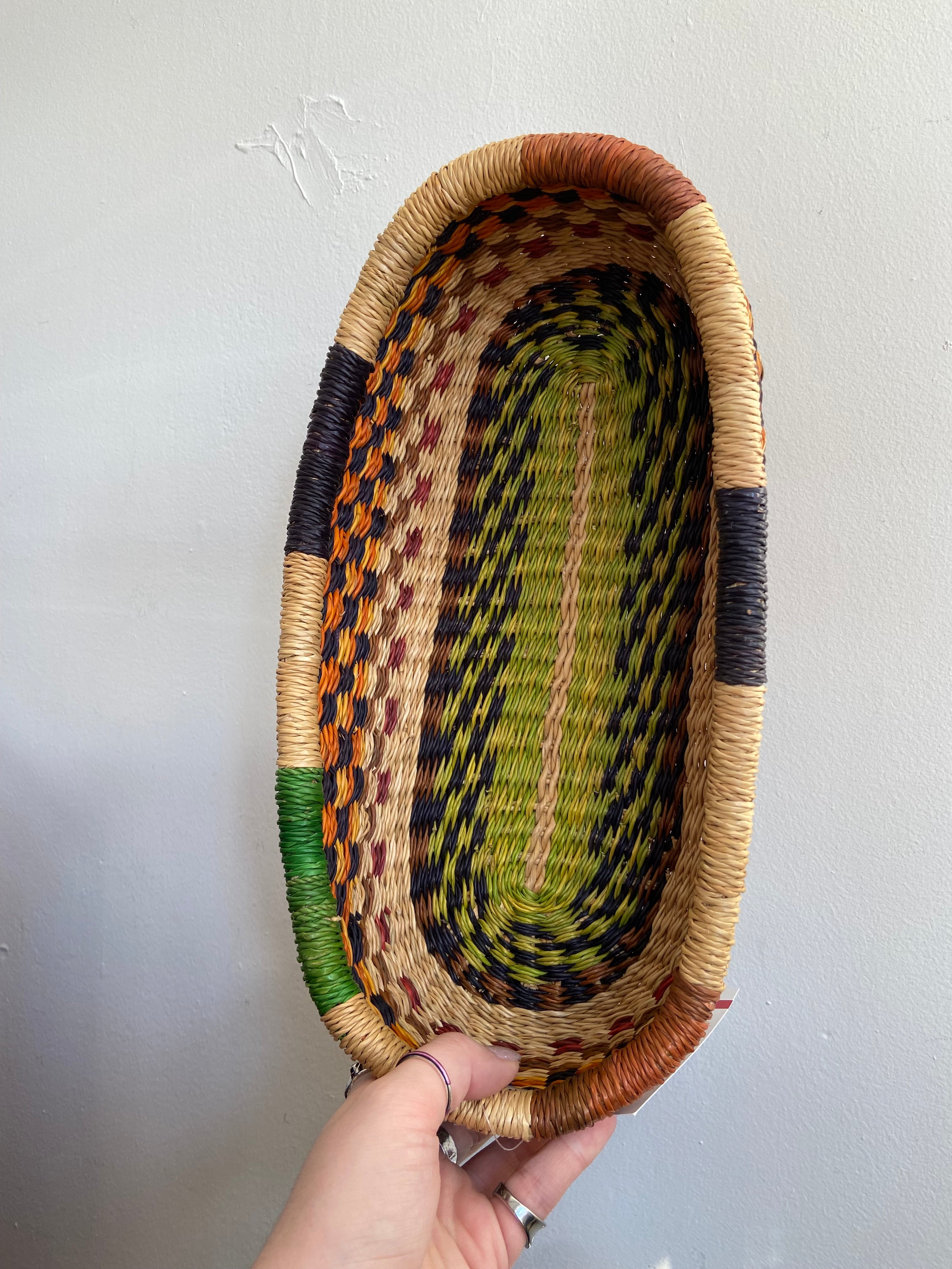 Materials: Veta Vera Grass - Measures: 13”L x 6”W at widest x 2.75”H including lip - Colors: Assorted - Care: Reshape with cold water - Handcrafted in Ghana