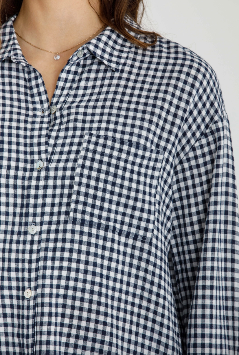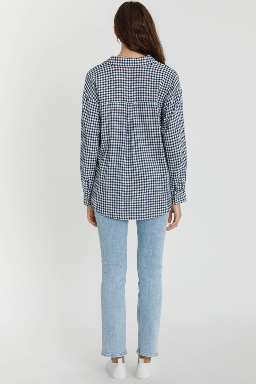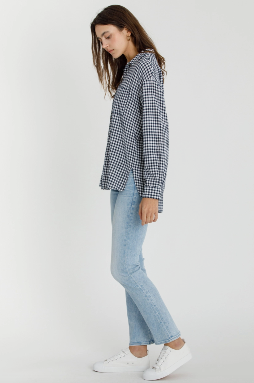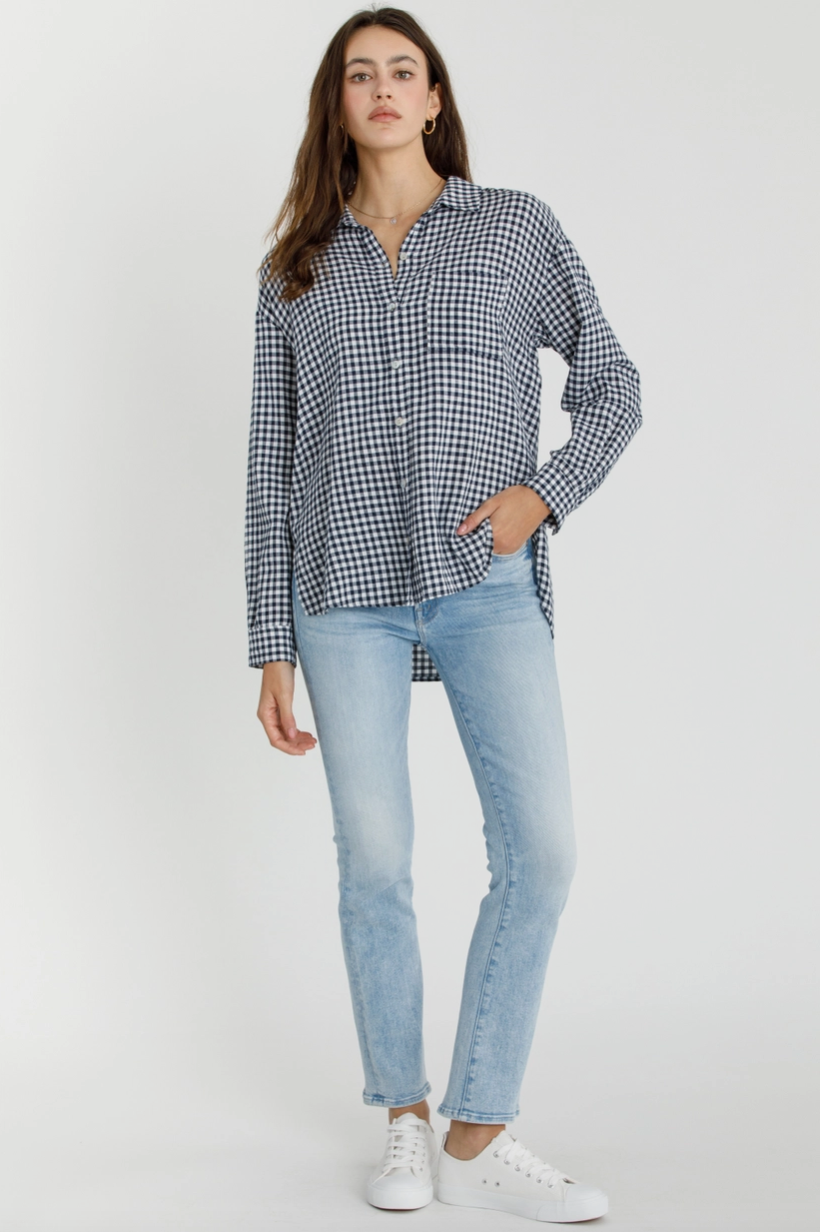 A classic long sleeve button down shirt. The lightweight and gingham print make this top perfect for summer. Pair with your favorite cut offs and sandals for a easy summer look.