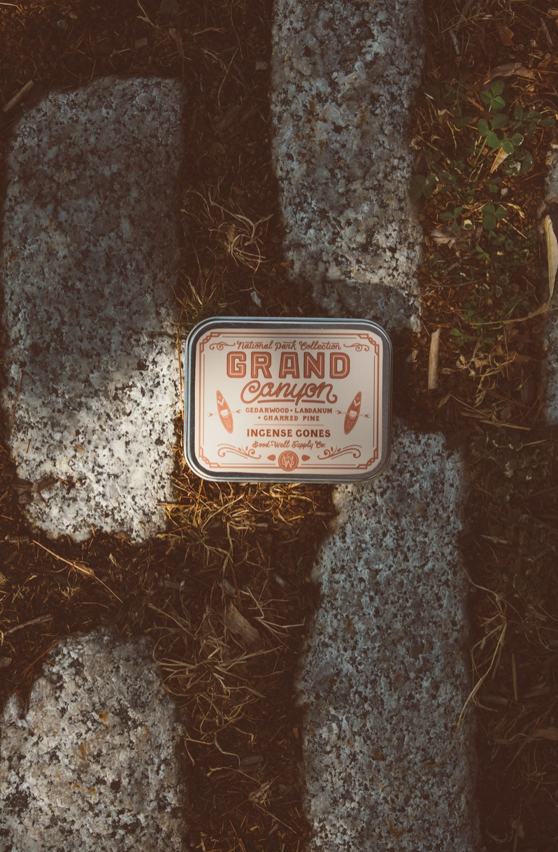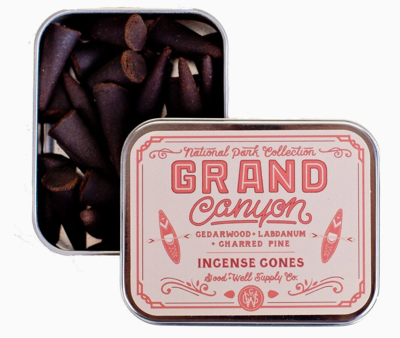 The Grand Canyon incense cones are hand-dipped and are housed in a sturdy aluminum tin; the lid can be used as a burning surface. Each cone will burn for 20-30 minutes with a scent longevity of 2-3 hours. 25 count.