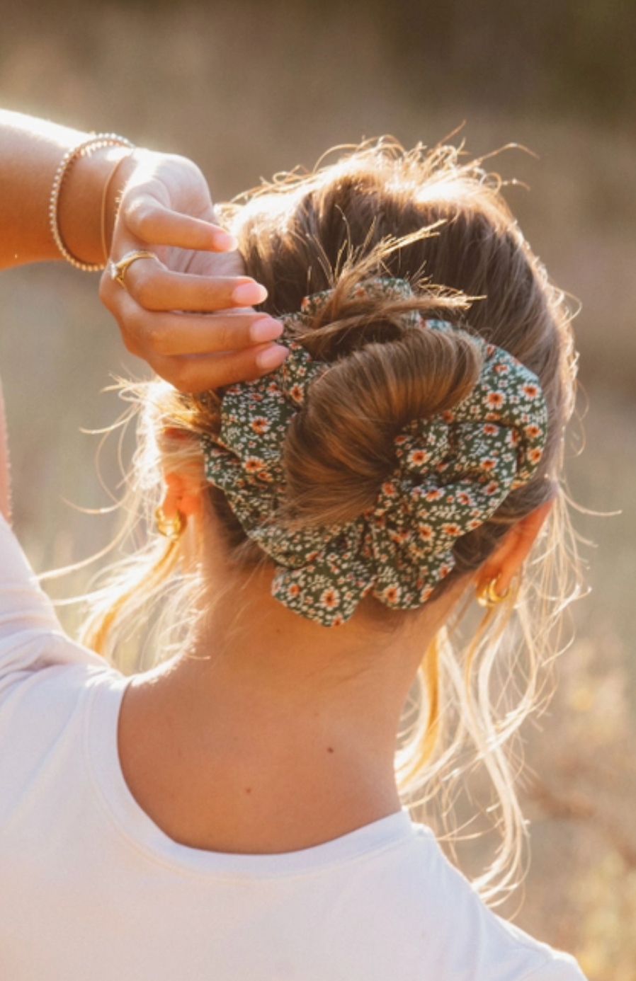 This jumbo scrunchie is the perfect back to school and fall season accessory. It is made in a pretty, green fabric with most perfect floral pattern. It'll be the perfect addition to your hairstyles this fall.