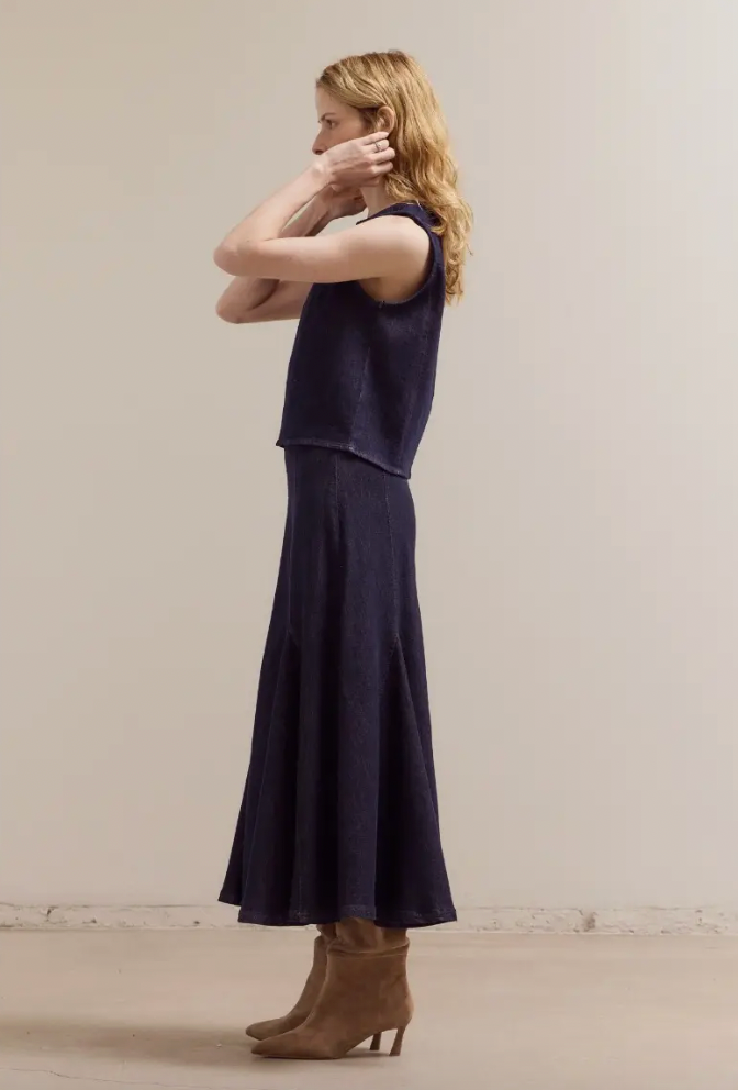 The Indigo Denim Top is a stretchy sleeve material in the prettiest dark denim. We see this top paired with a fun trouser and beaded jewelry. Wear alone or layer over a button down on cooler days.