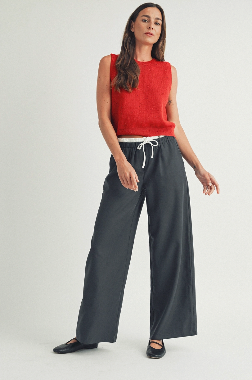 A relaxed wide leg silhouette with clean seam lines . This pants feature a contrast drawstring waistband for a sporty finish, a soft structured fabric with comfortable drape, and side pockets for functional detail. Effortless to style with tanks, tees, or knits.