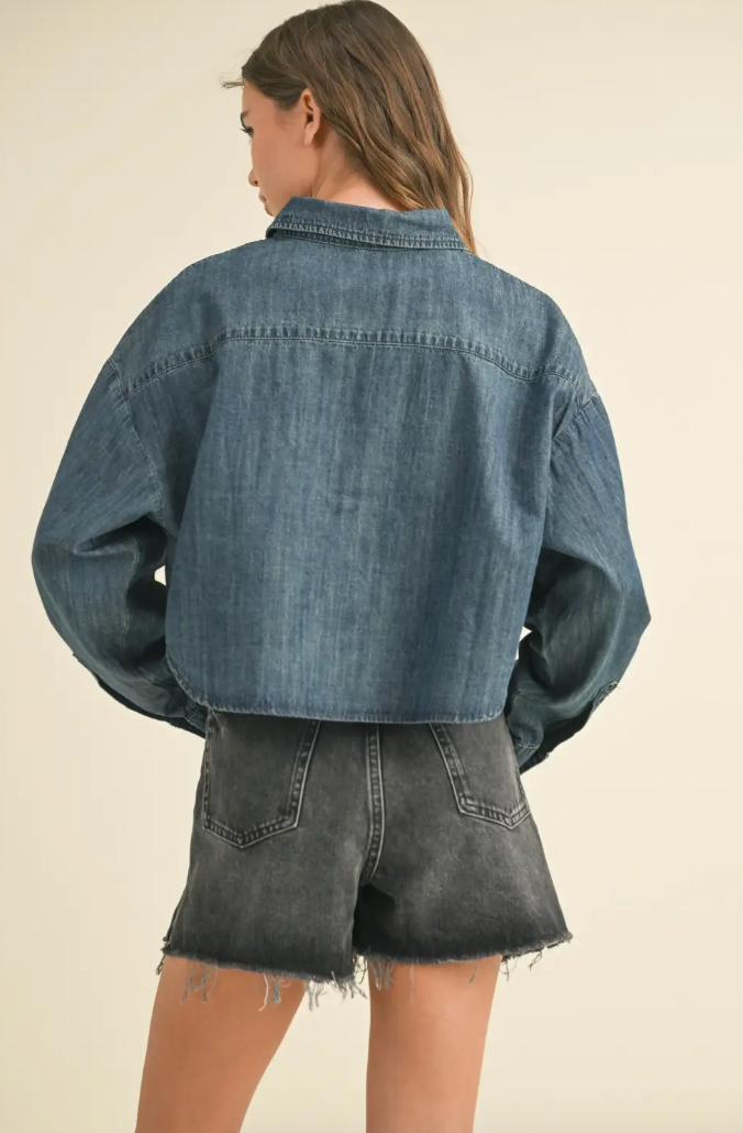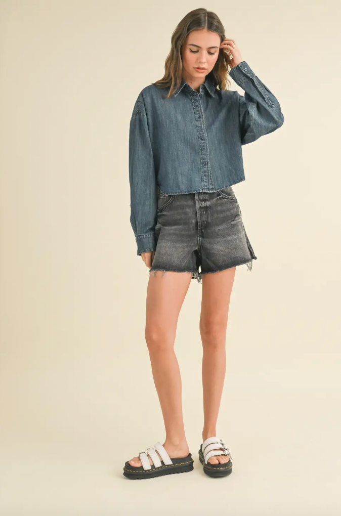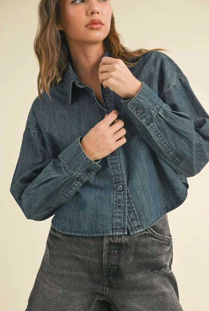 The Kara Cropped Denim Button Down is a fun take on a classic denim top. This top is cropped at the perfect length that meets your high rise pant. Pair with just about anything and wear on repeat.