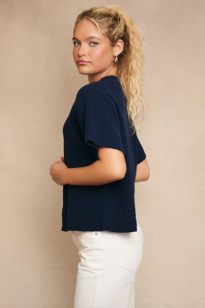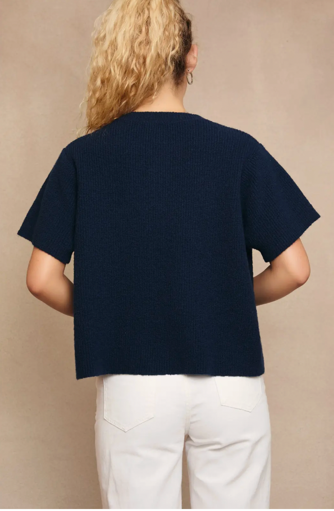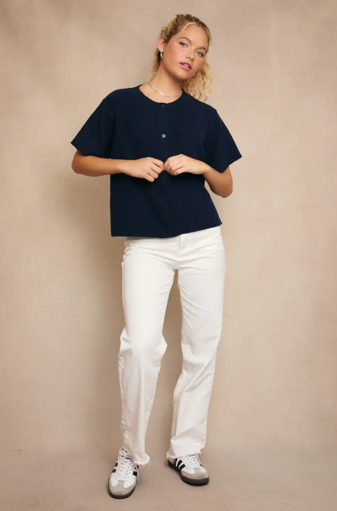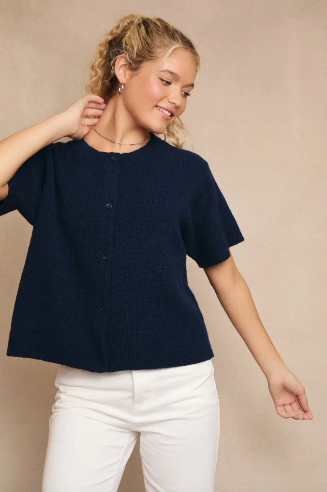 The Lee Short Sleeve Cardigan is a soft and cozy top perfect for fall. This top features functional buttons and a rounded neck. We see it paired with a fun printed pant, boots and gold jewelry.