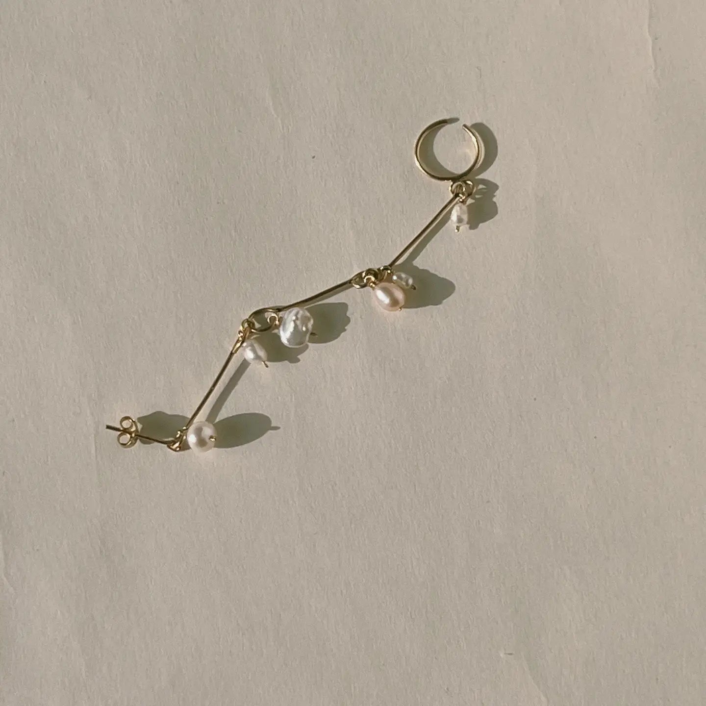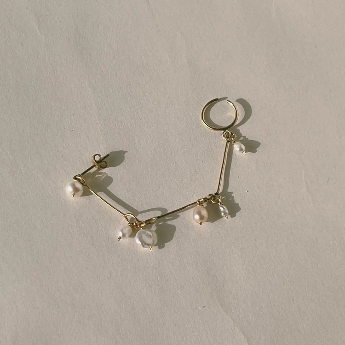 * An earring made to drape your ears. The earring features hand forged links sprinkled with a variety of Freshwater Pearls.
