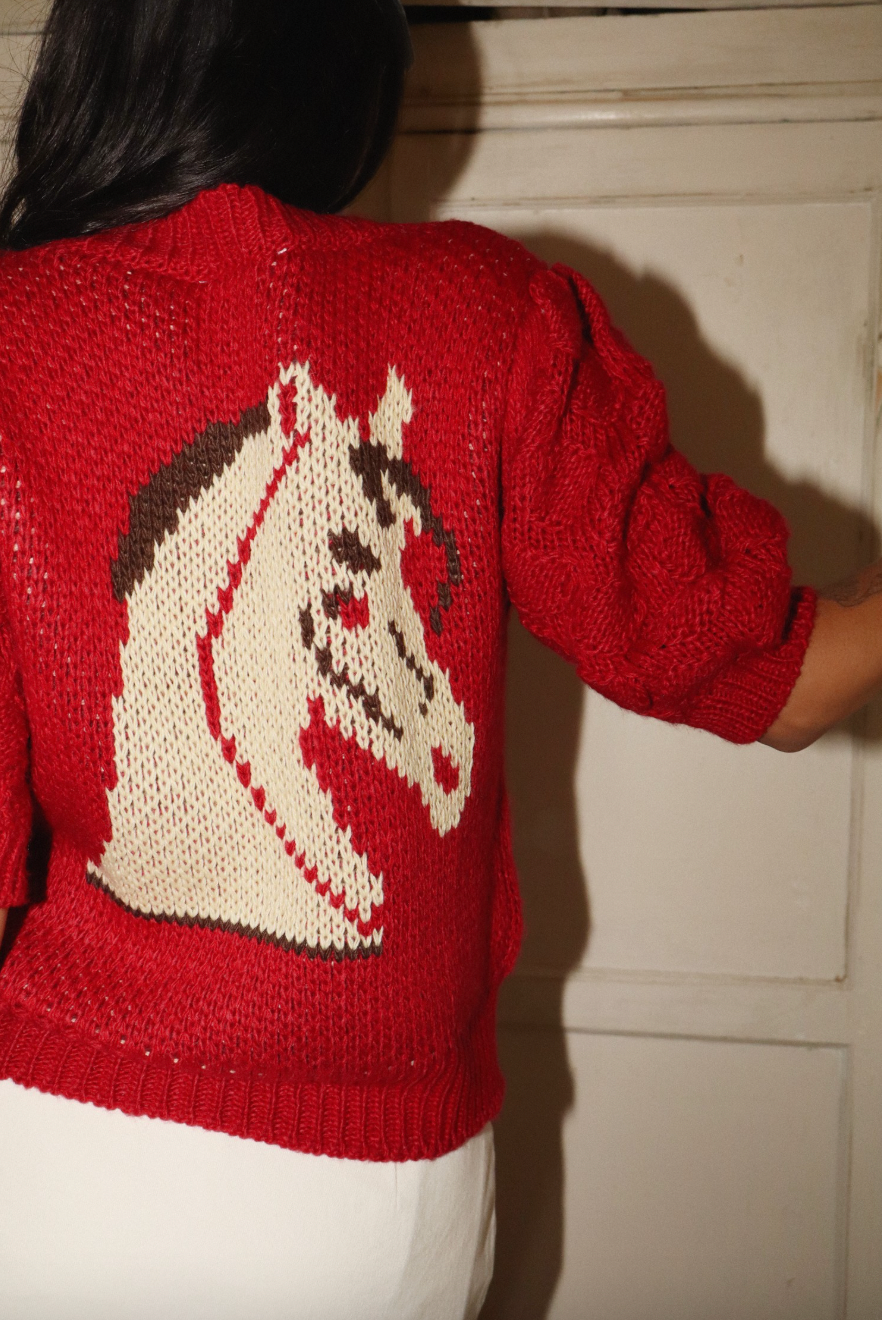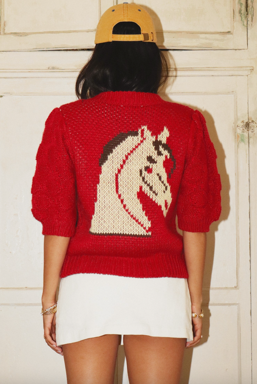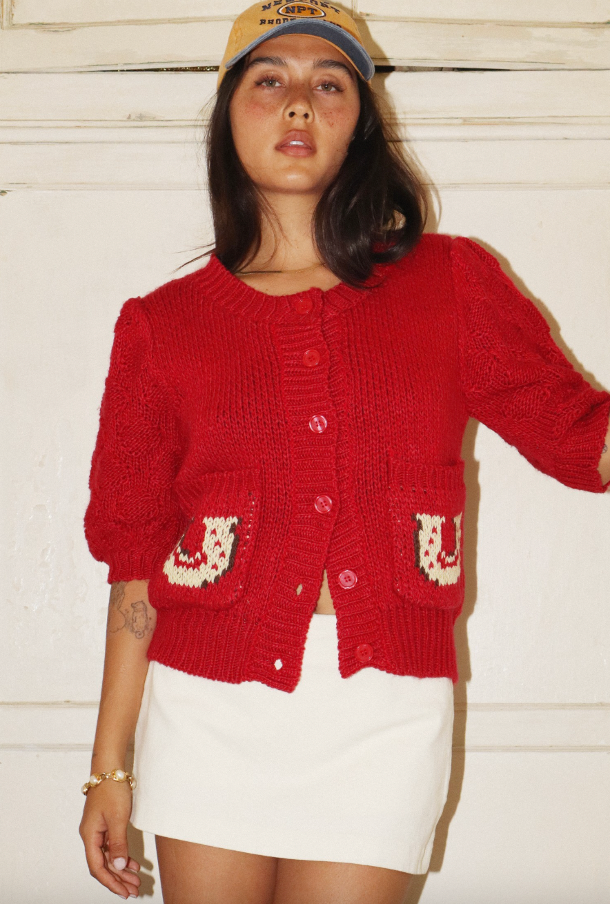 The Lucky You Cardigan is the perfect fall transitional piece. We love the puff sleeve and horse knit print. Pair with pretty much any bottom and wear on repeat.