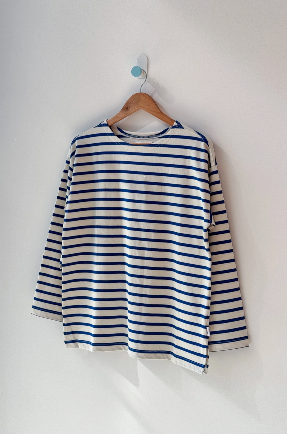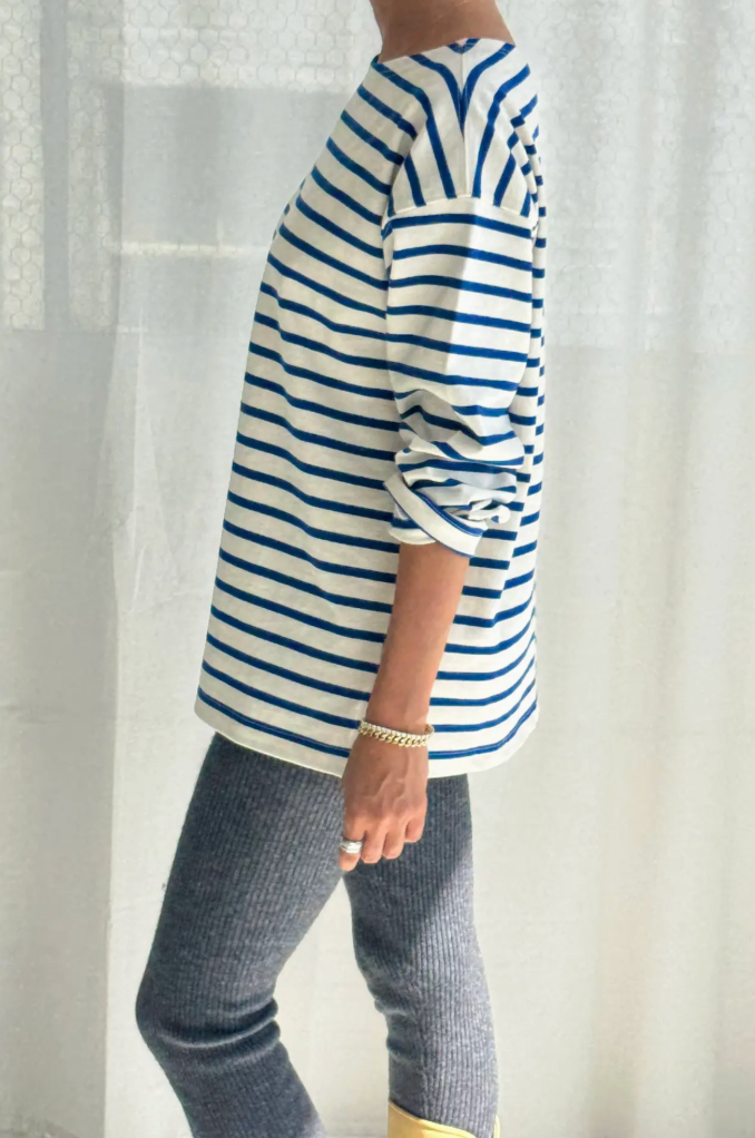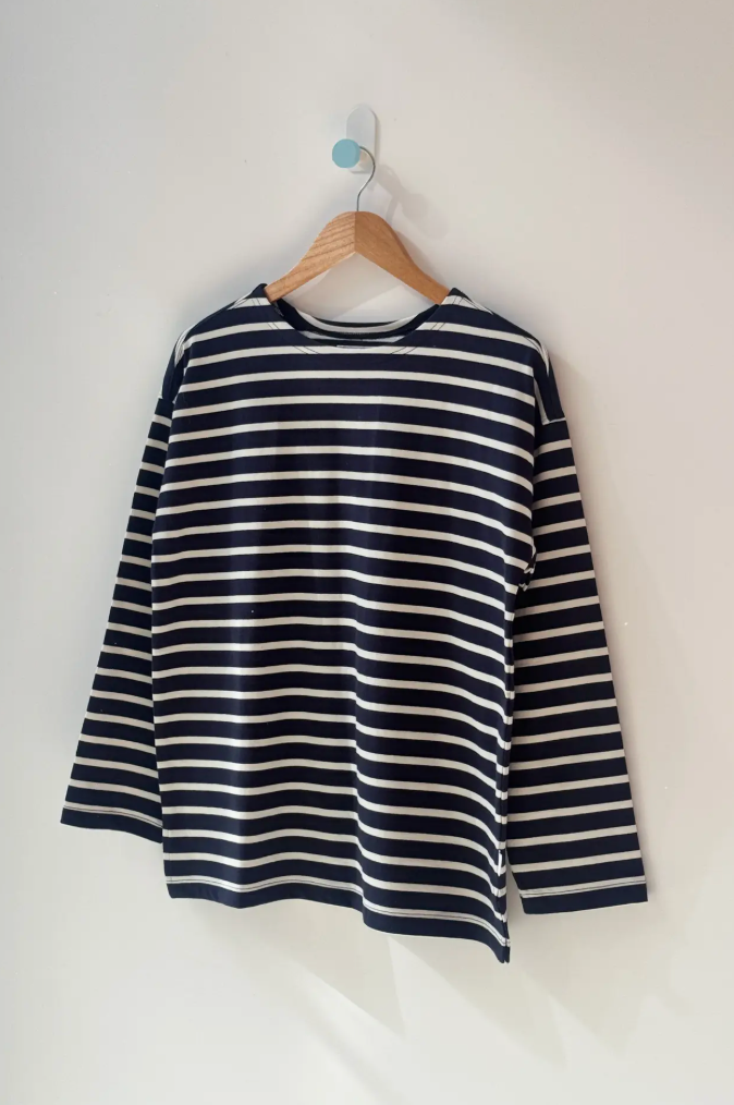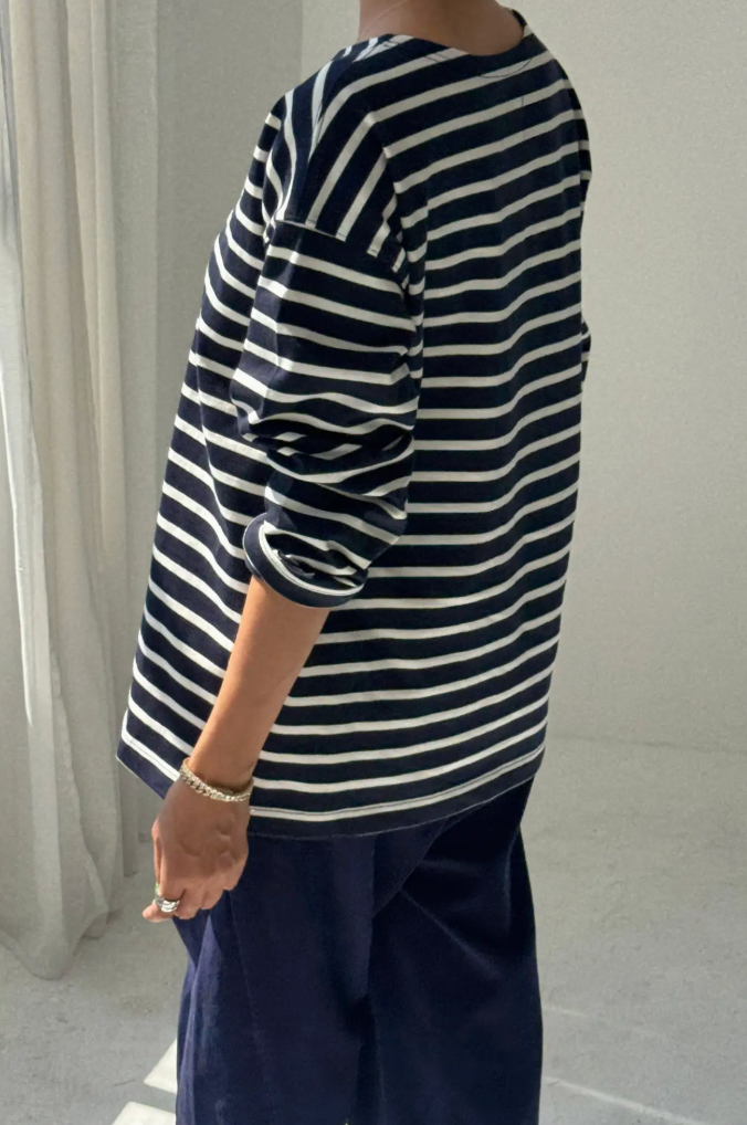 Add a touch of Parisian flair to your wardrobe. The Marseille Top takes inspiration from the timeless Breton stripe uniform, featuring a classic round neckline and an oversized, full-length fit that gently sweeps the hips. Crafted from durable, heavyweight cotton, it offers structure without sacrificing softness, making it an ideal choice for both elevated and casual looks.