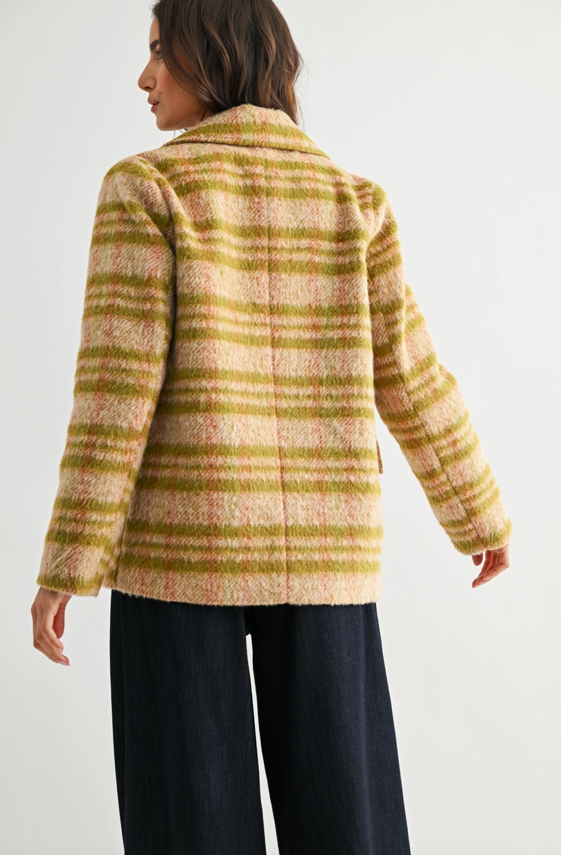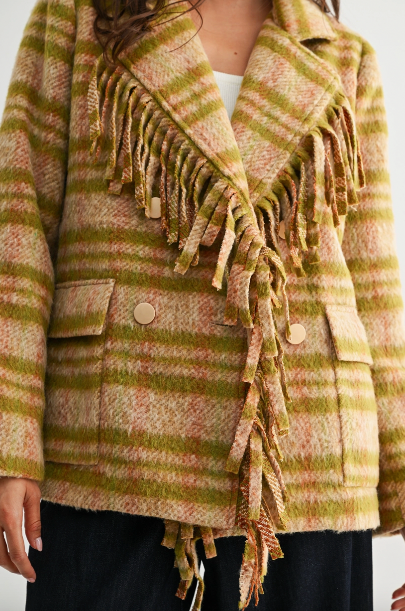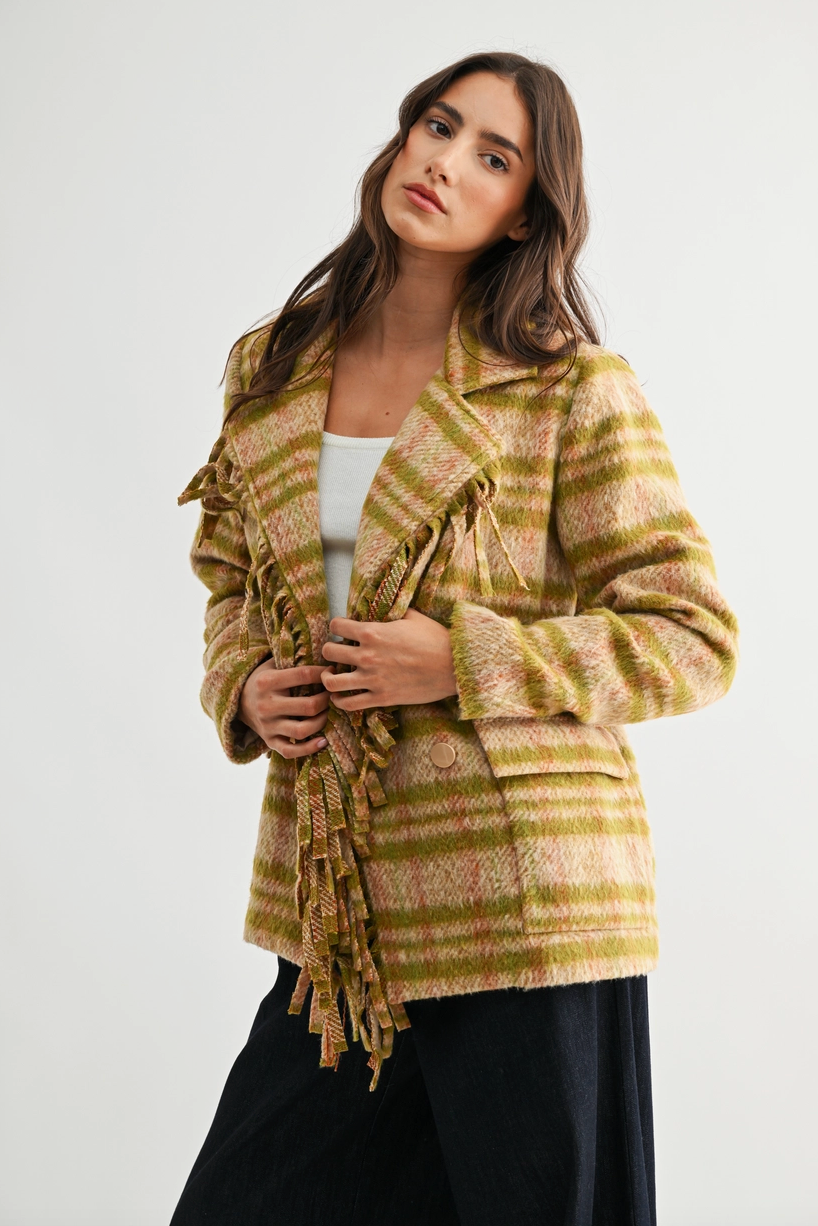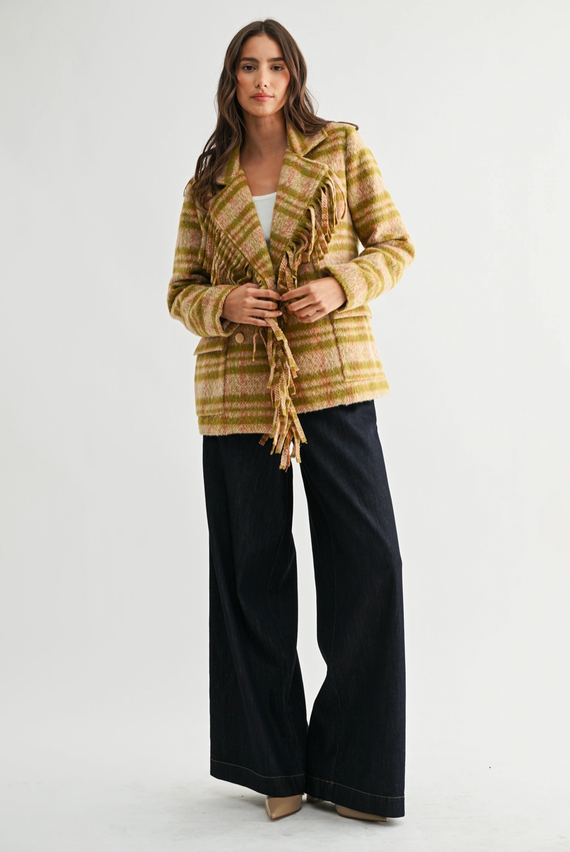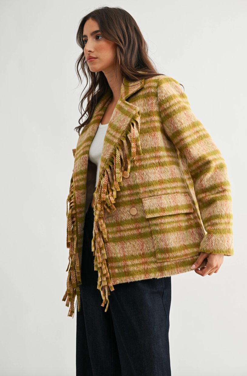 Add a Western-inspired twist to your cold-weather wardrobe with the Meg Plaid Fringe Jacket. Featuring a classic plaid pattern in warm earthy tones, this jacket stands out with its fringe accents along the front and lapel for a playful yet chic touch. The double-breasted design and tailored fit provide structure, while the soft wool-blend fabric keeps you cozy and stylish through the season.