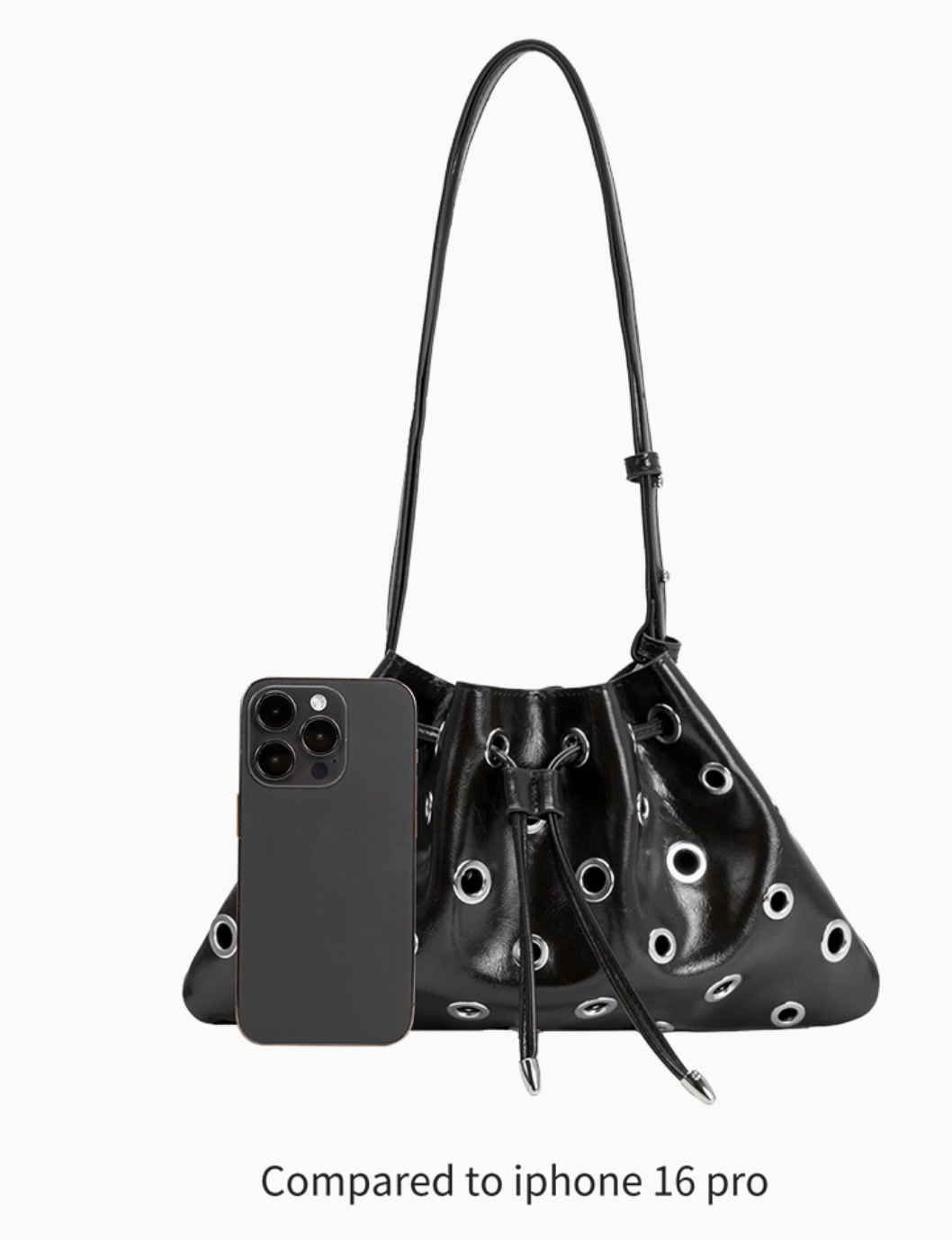 Paloma features bold, eye-catching grommets and a wide bottom for maximum storage. The adjustable strap offers versatile wear, whether slung over your shoulder or worn crossbody. This bag blends fashion and function with ease, perfect for everyday essentials or a night out!
