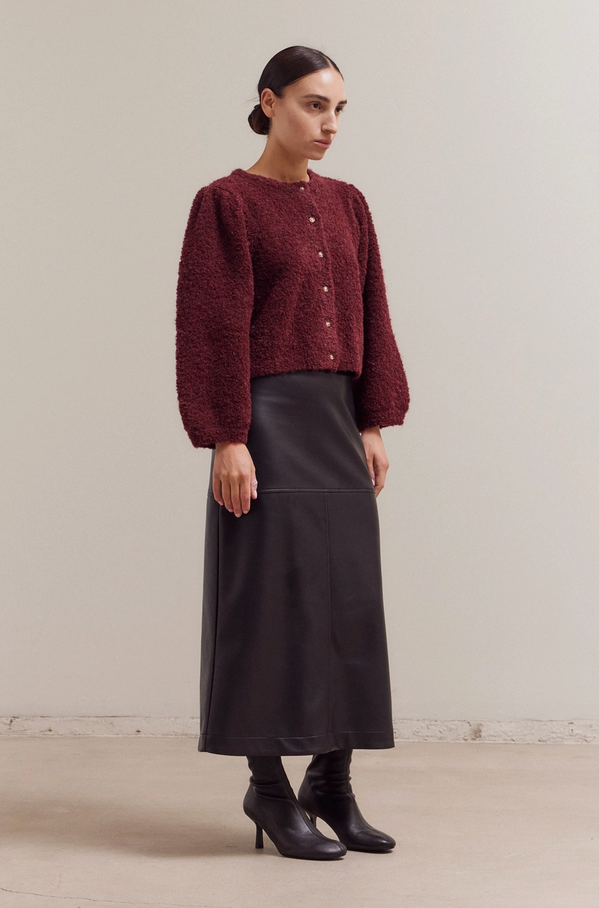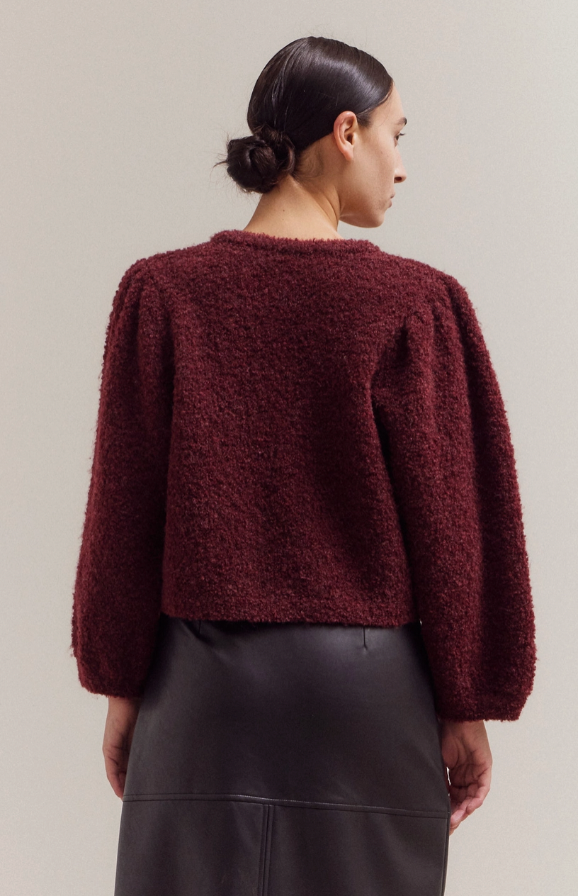The Port Puff Sleeve Cardigan in a fun fluffy cardigan perfect for chilly days. We love the deep burgundy color, puffy sleeve and neutral buttons. Wear buttoned up with a cute skirt or wear open and layer over a tee.