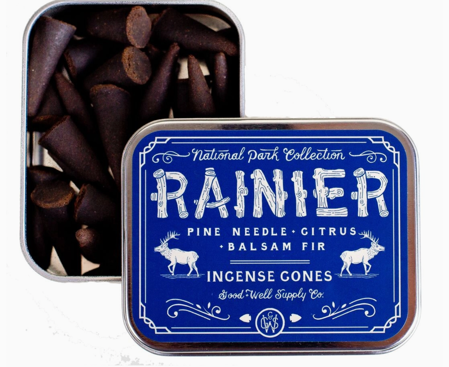 The Rainier incense cones are hand-dipped and are housed in a sturdy aluminum tin; the lid can be used as a burning surface. Each cone will burn for 20-30 minutes with a scent longevity of 2-3 hours. 25 count.