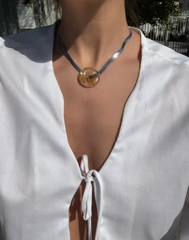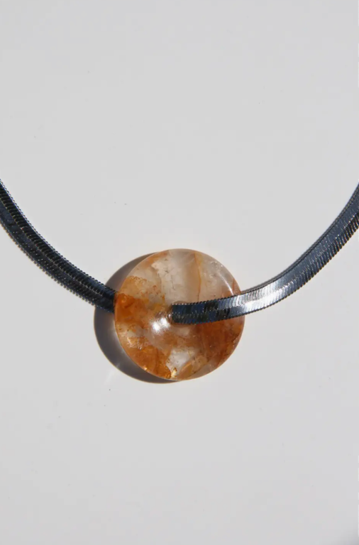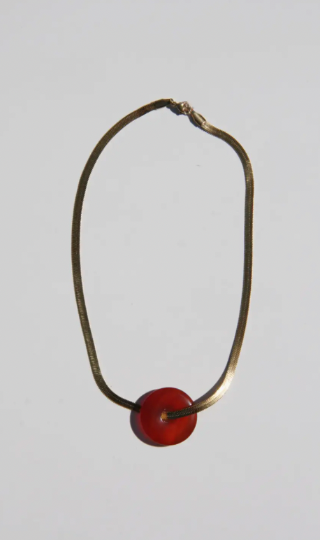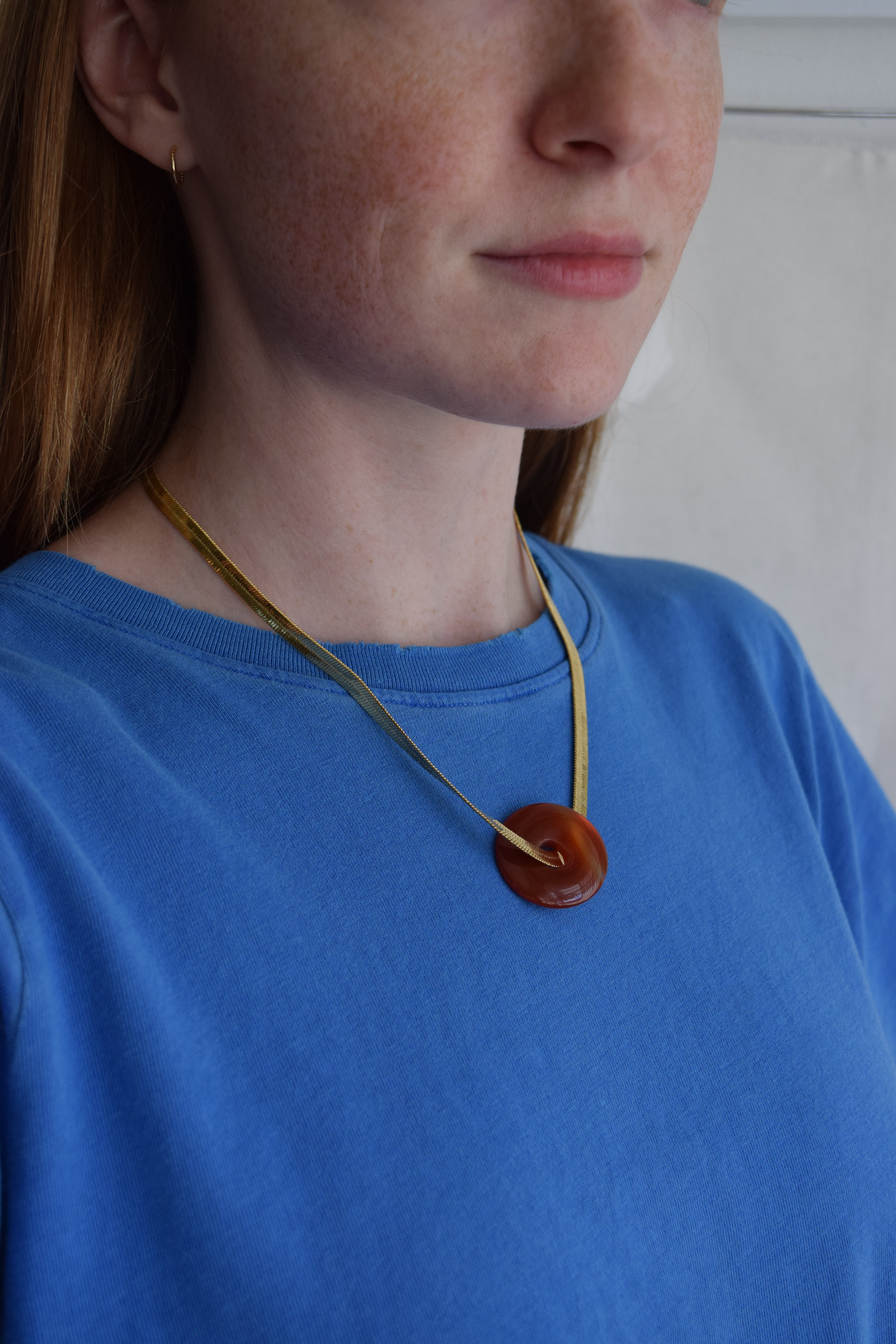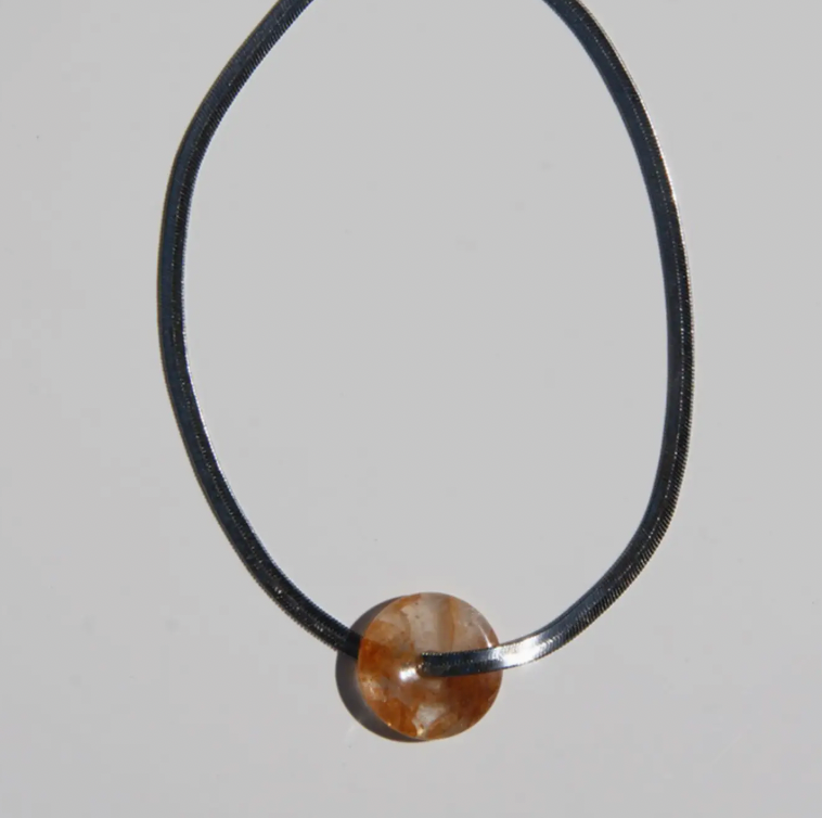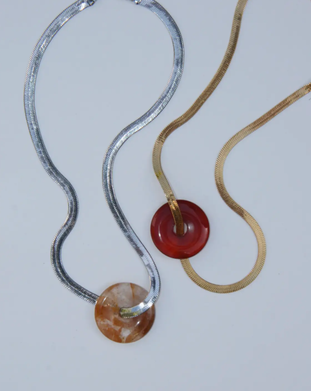 Refined elegance meets contemporary design. The lustrous metal of the flat herringbone chain creates a sophisticated foundation for the distinctive gemstone donut centerpiece. Understated luxury with visual impact.