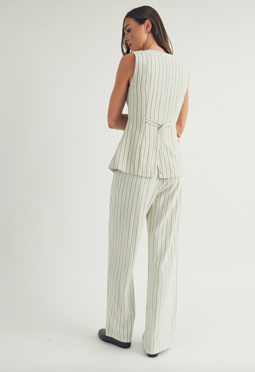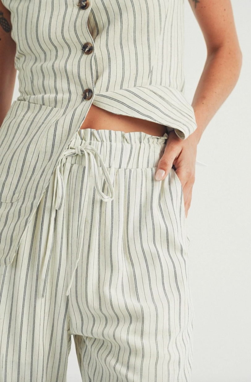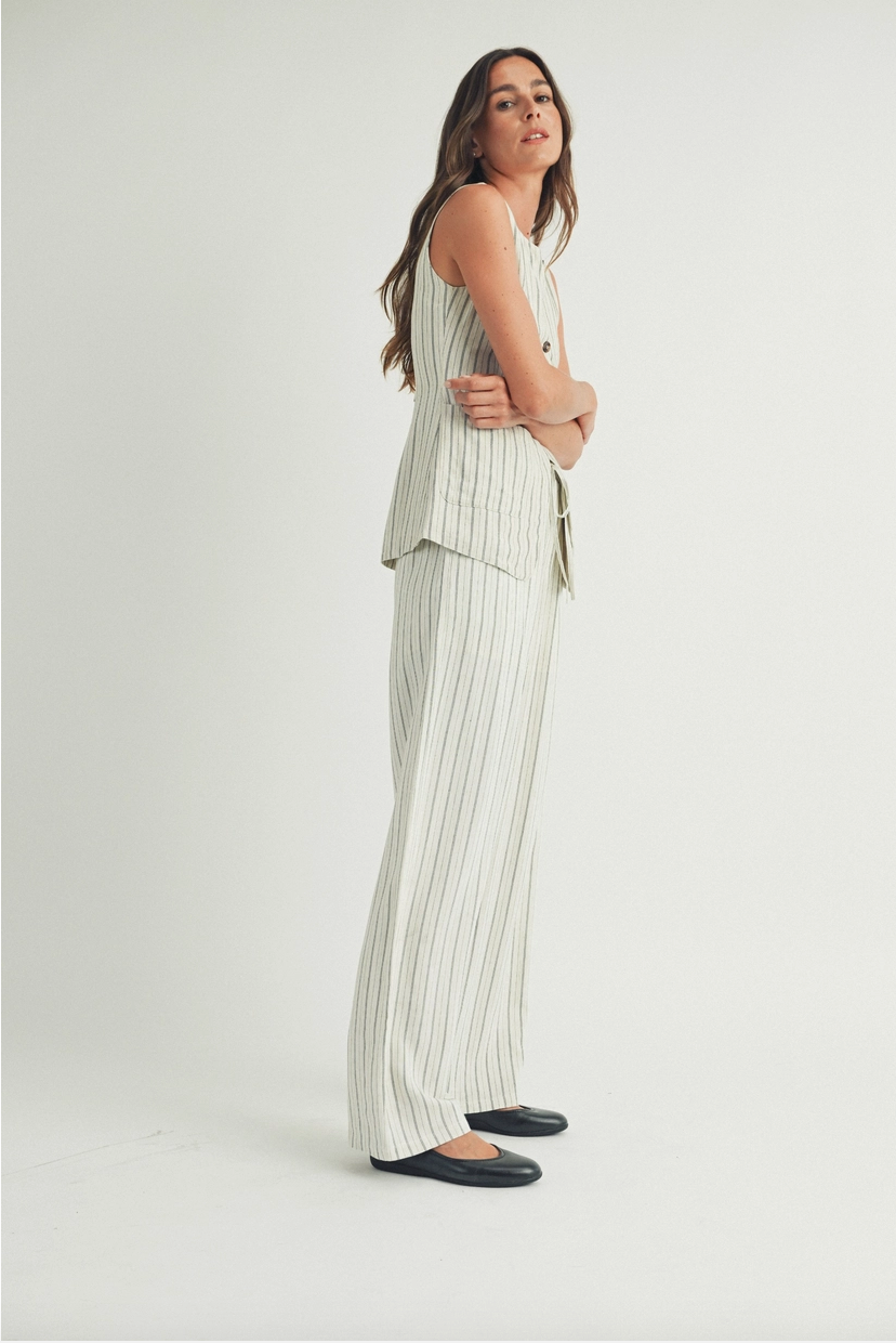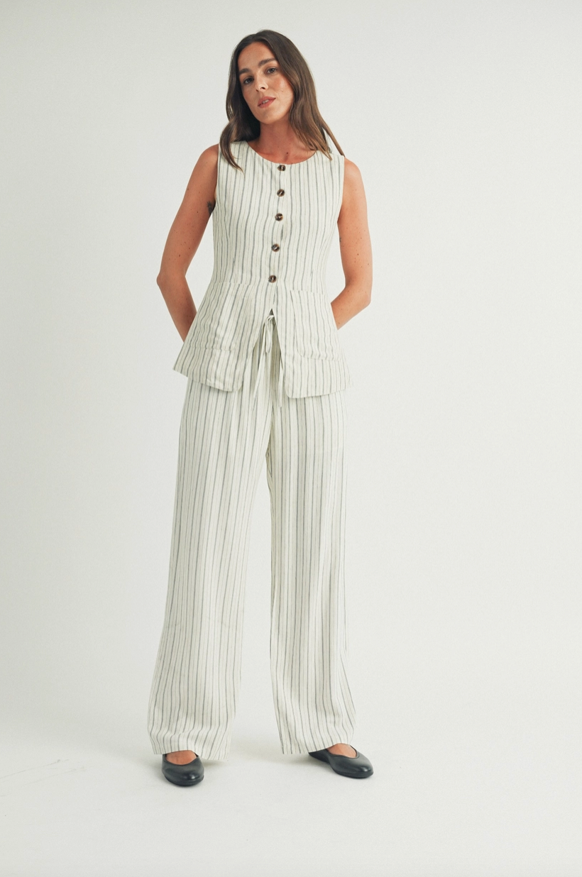 The Sadie Linen Wide Leg pant has a straight-leg silhouette with a subtle drape. It features an elasticized waistband with adjustable drawstring tie. The vertical pinstripe pattern offers a lengthening effect . It has lightweight woven fabric with a breathable finish. Ideal for warm-weather days or relaxed polished looks . Pair with the matching top or a tee.