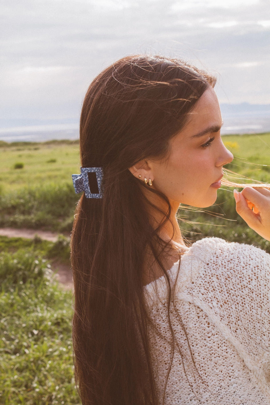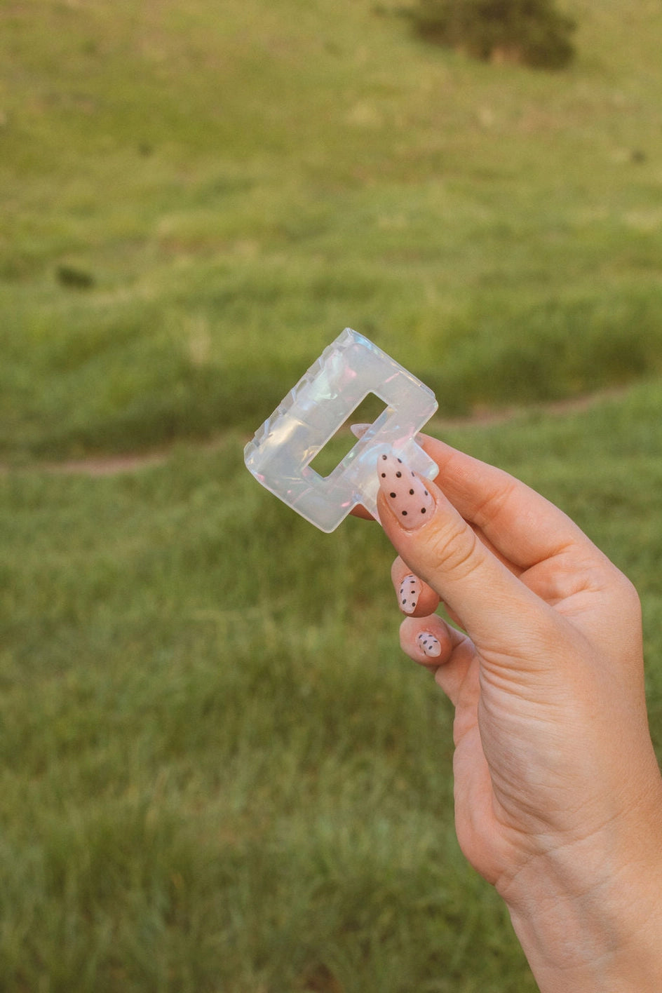 This small rectangle claw clip is so perfect and festive for the 4th of July! It comes in the cutest blue floral pattern, as well as a pretty pearly transparent and made out of a high quality acetate material. The best way to elevate your updo for the day. This is a small 2 inch claw clip.