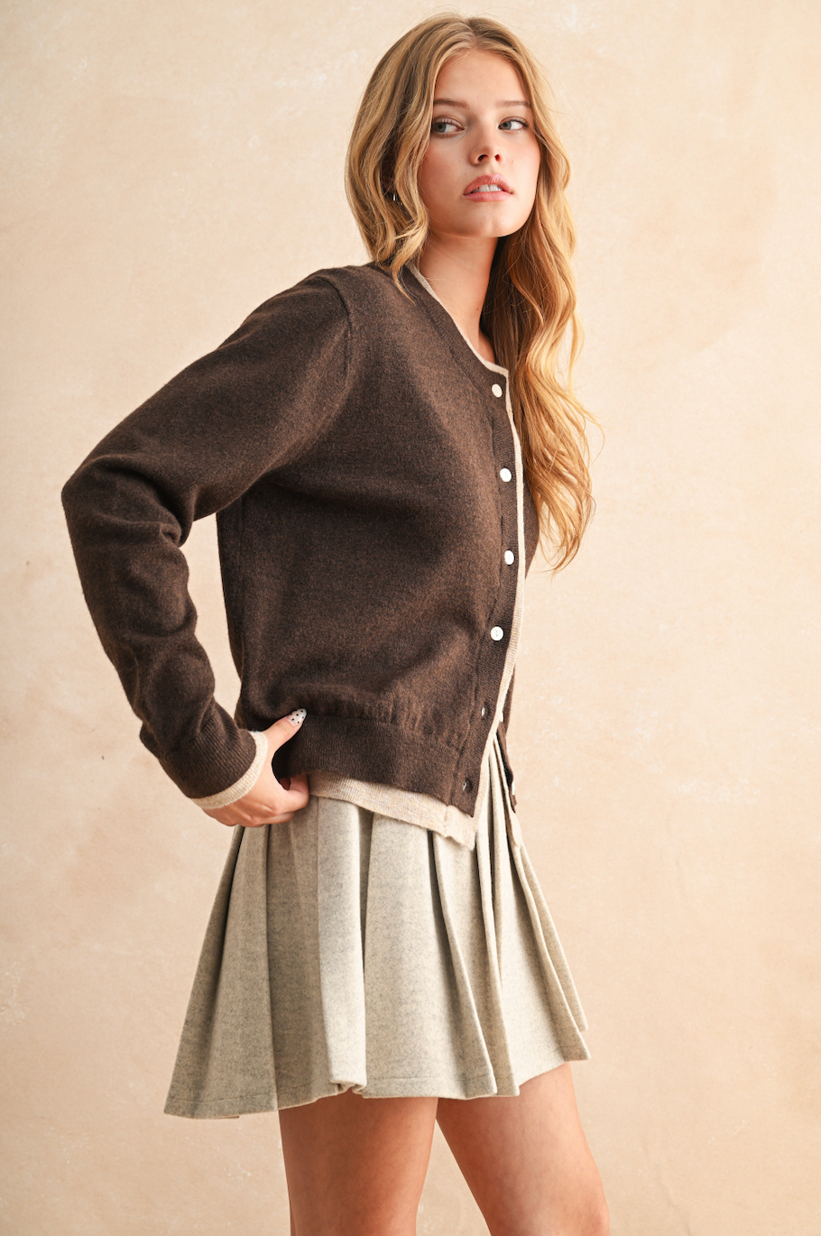 The Stevie Contrast Sweater is an easy to wear cardigan. Pair this top with a skirt, or pants. You can't go wrong. We love the pop of color, it gives a layered look.