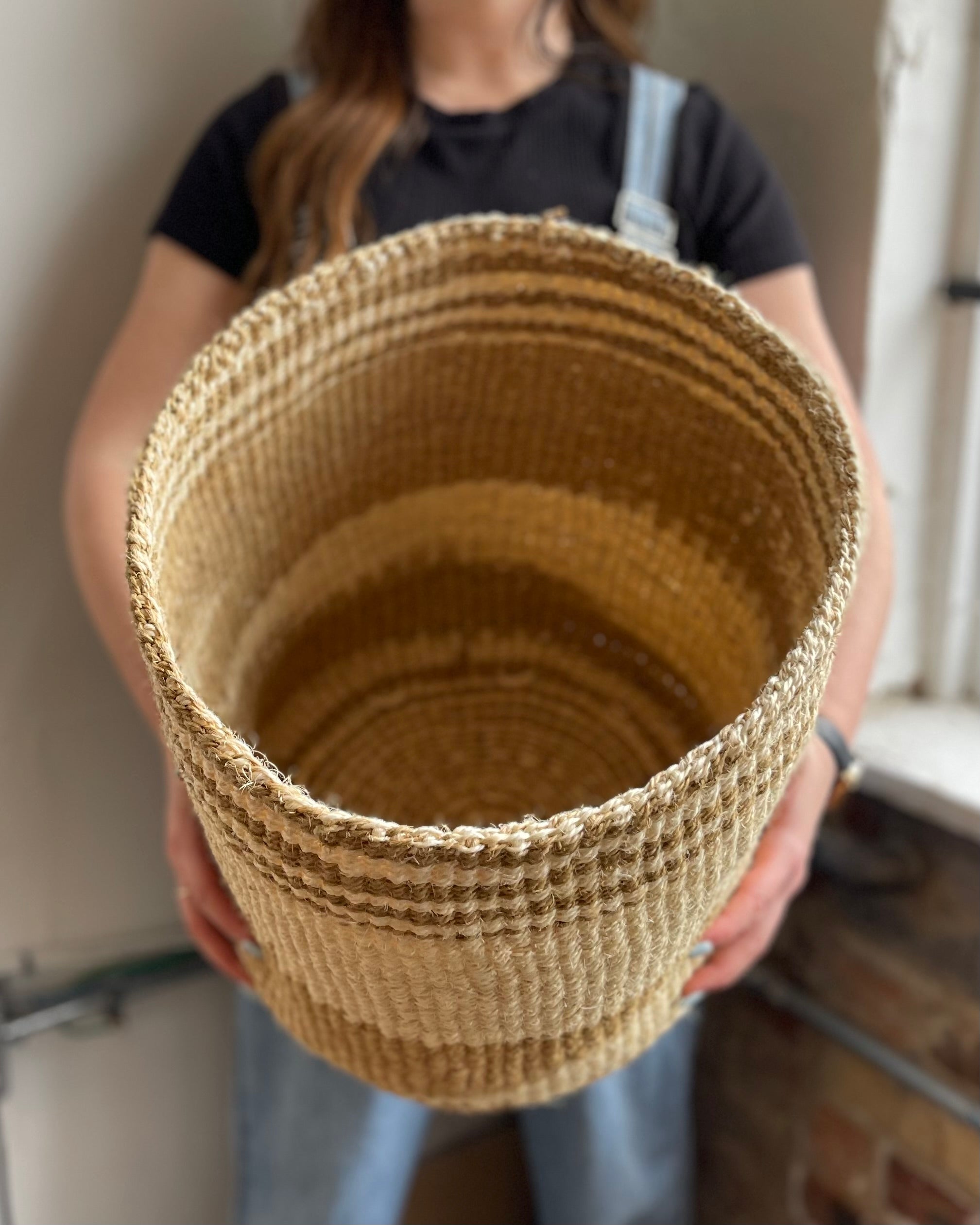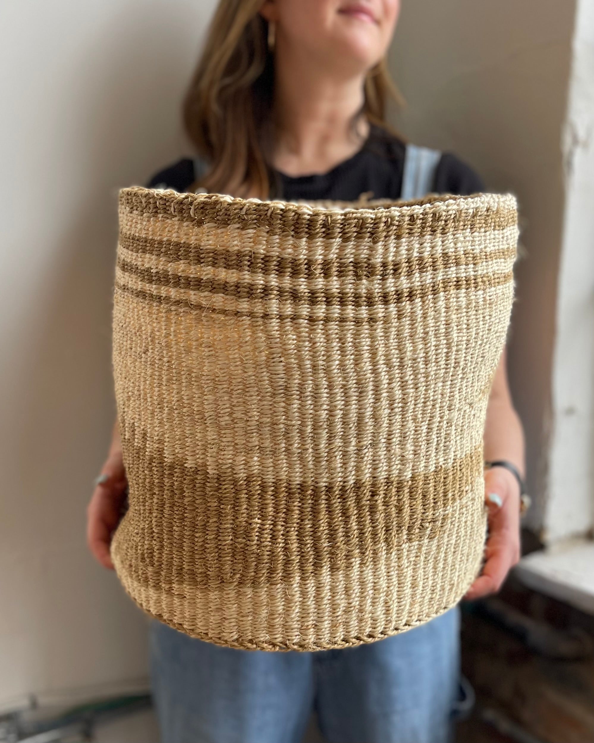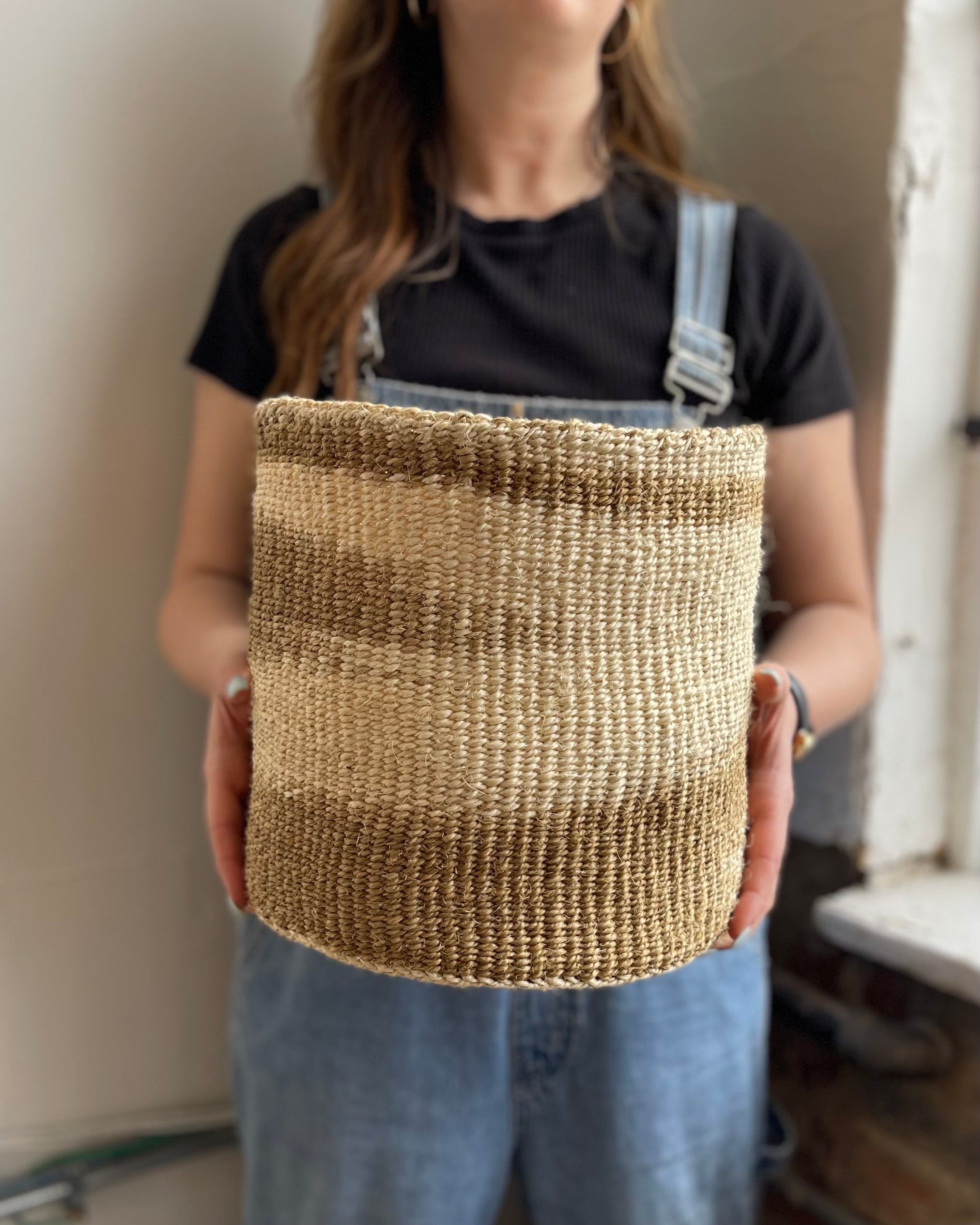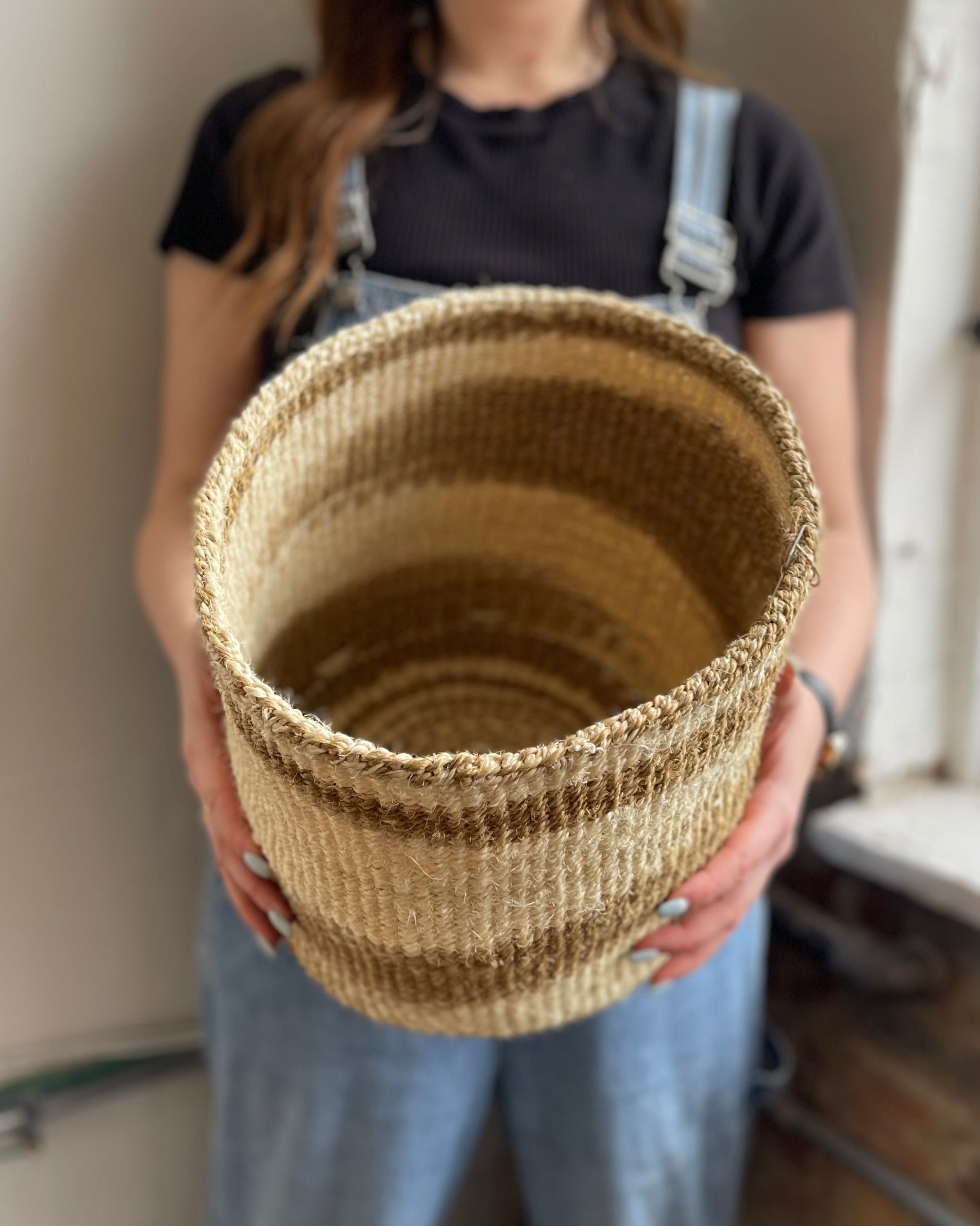 These sisal, woven baskets are handmade by a weaving cooperative in southeastern Kenya. They are naturally dyed using soot, lending to a unique variation in tone with each one. The pattern also varies from piece to piece, as each weaver has their own technique. These African baskets are great as plant holders, catchalls, toy baskets, storage baskets, or to liven up a space!