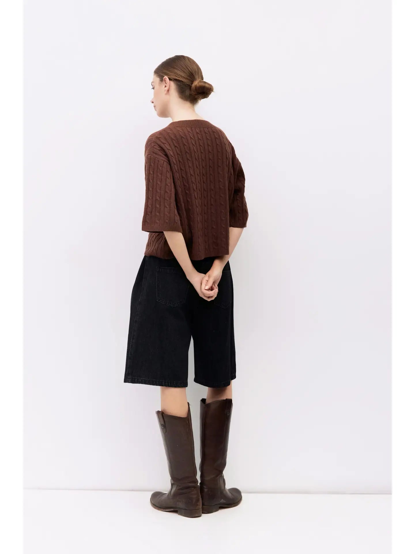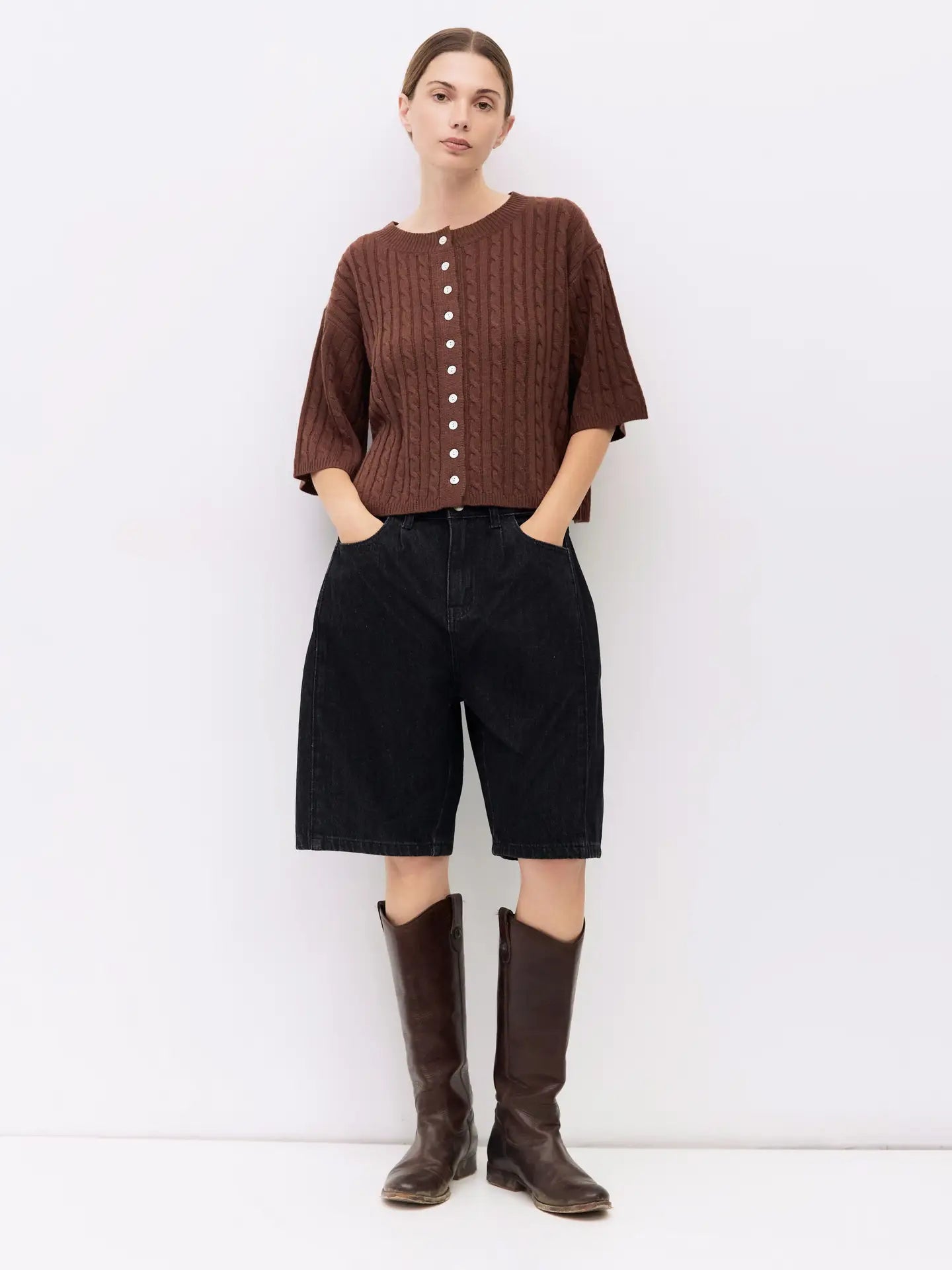 The Poppy Cardigan is a relaxed-fit piece crafted from midweight cable knit, featuring elbow-length sleeves for a fresh twist on a classic. With a wide ribbed neckline and front button closure, it's an effortless layering essential.