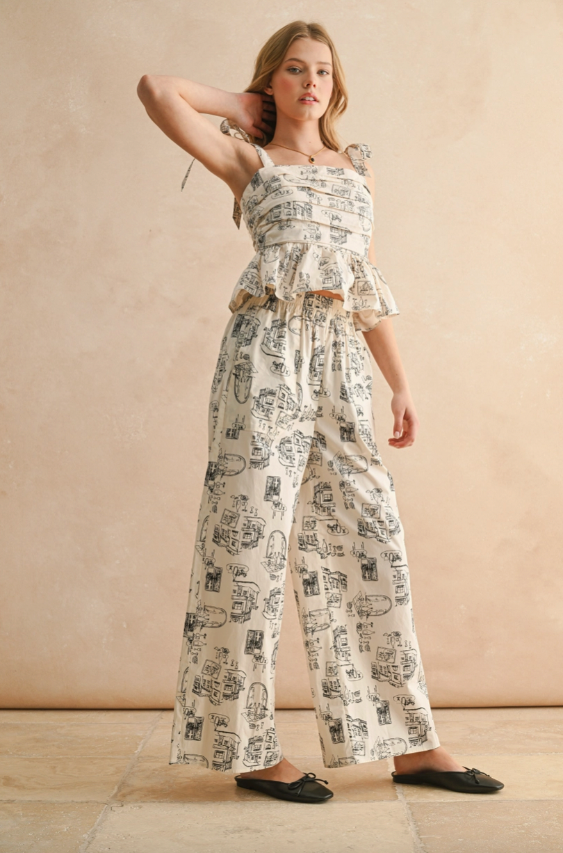 A super cute peplum top with a fun line drawn like print. We love the feminine look this piece has with the ties at shoulder and ruffle bottom. Pair with the matching pant for a cute set or style with your favorite denim.