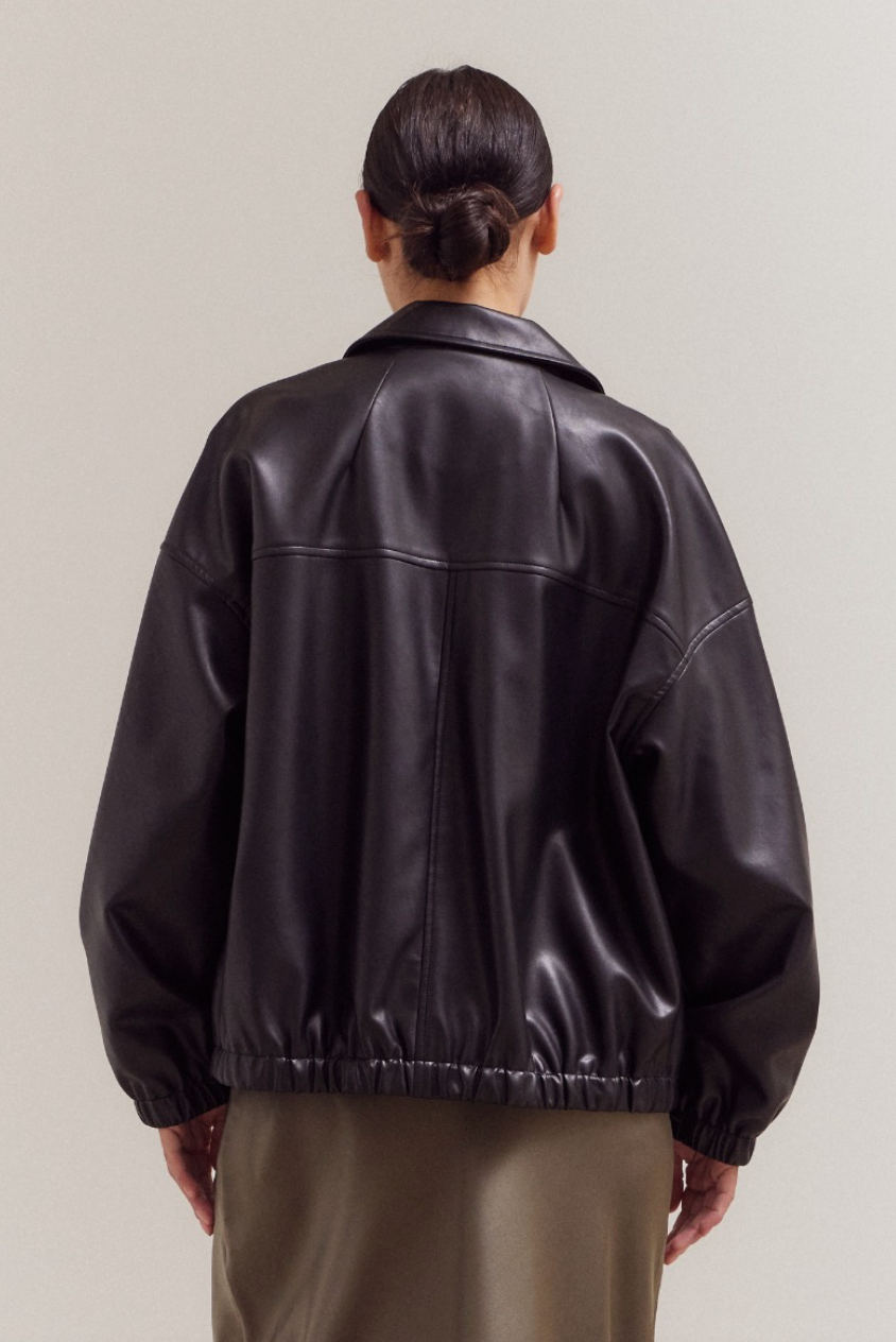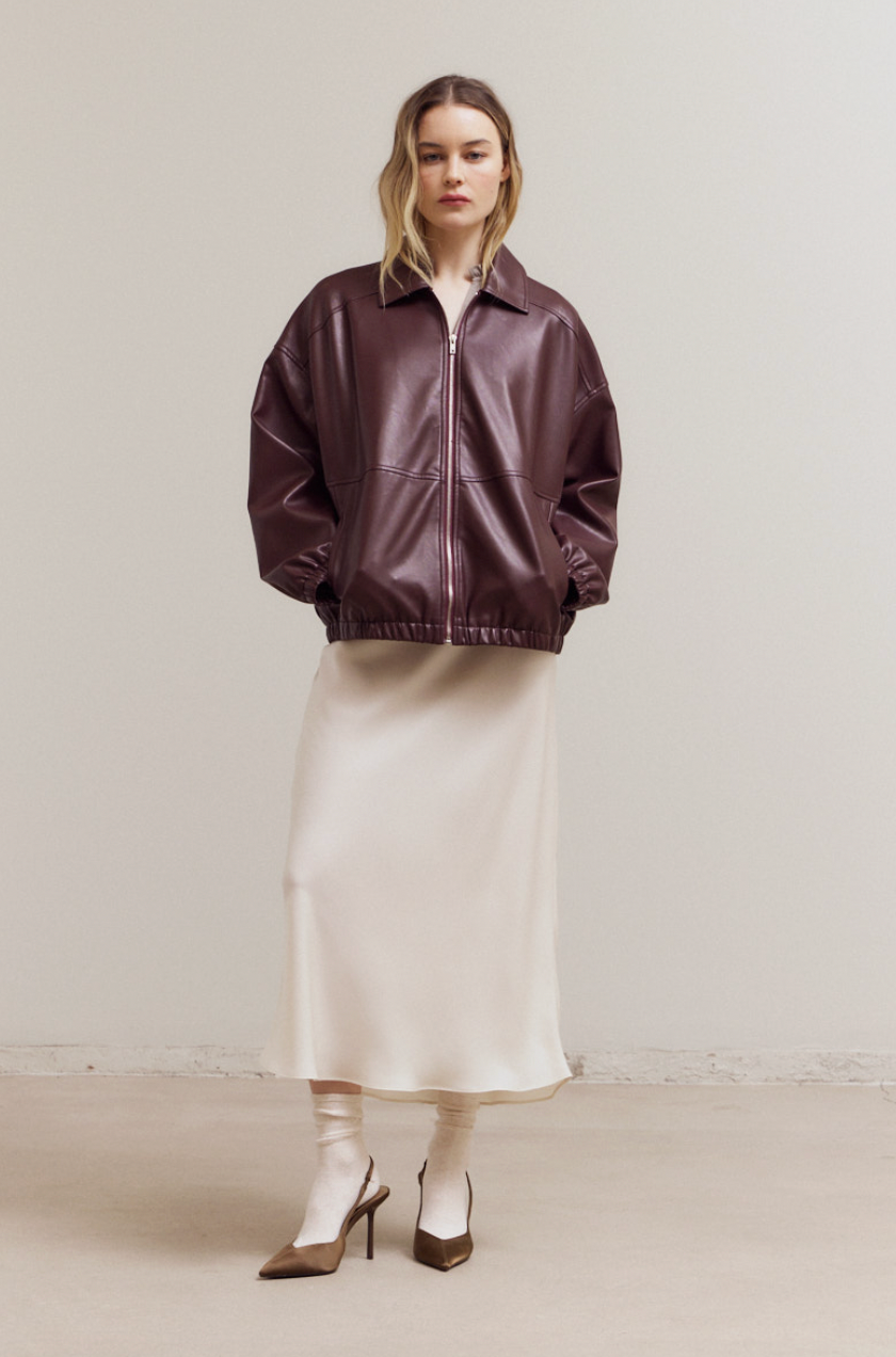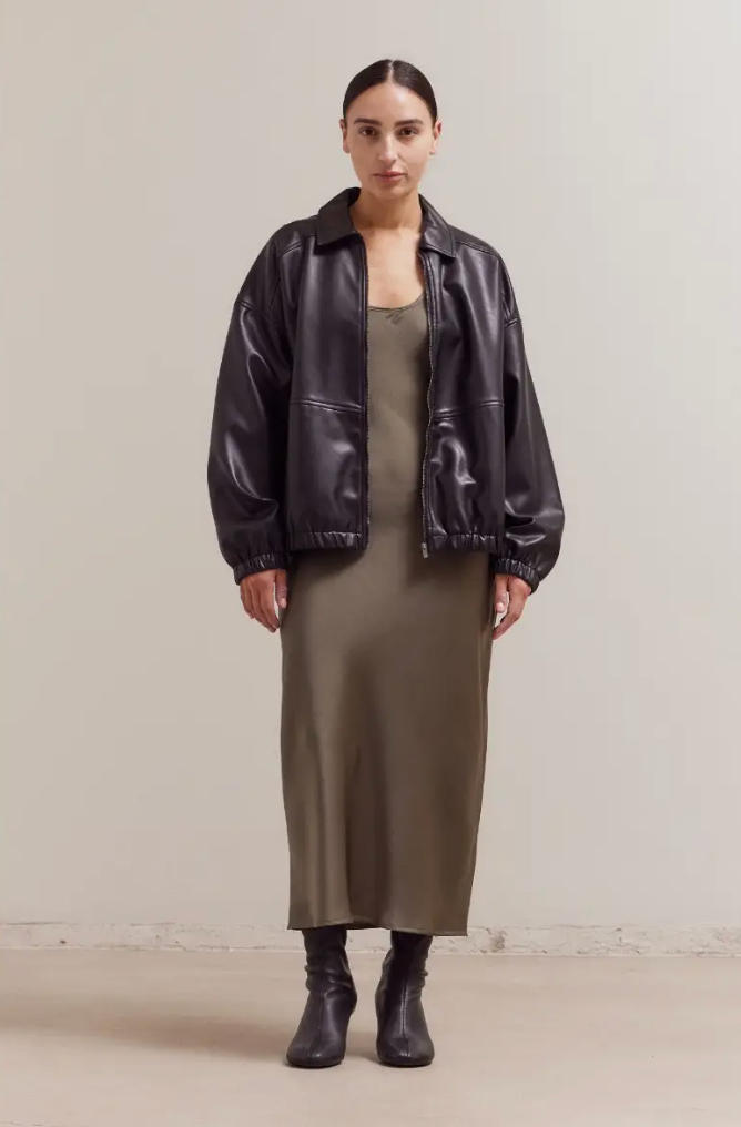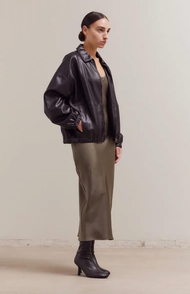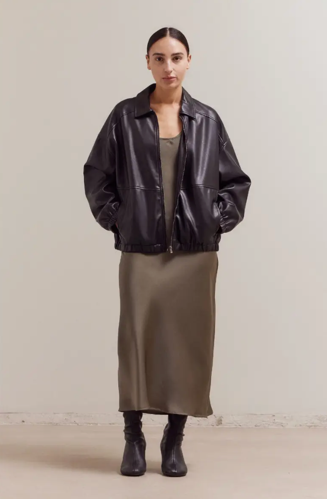The Vegan Leather Bomber is an oversized lightweight jacket. We love the texture this piece brings to an outfit. It screams borrowed from your boyfriend/ vintage vibes.