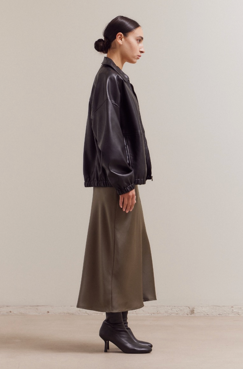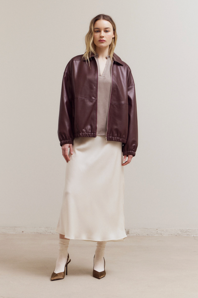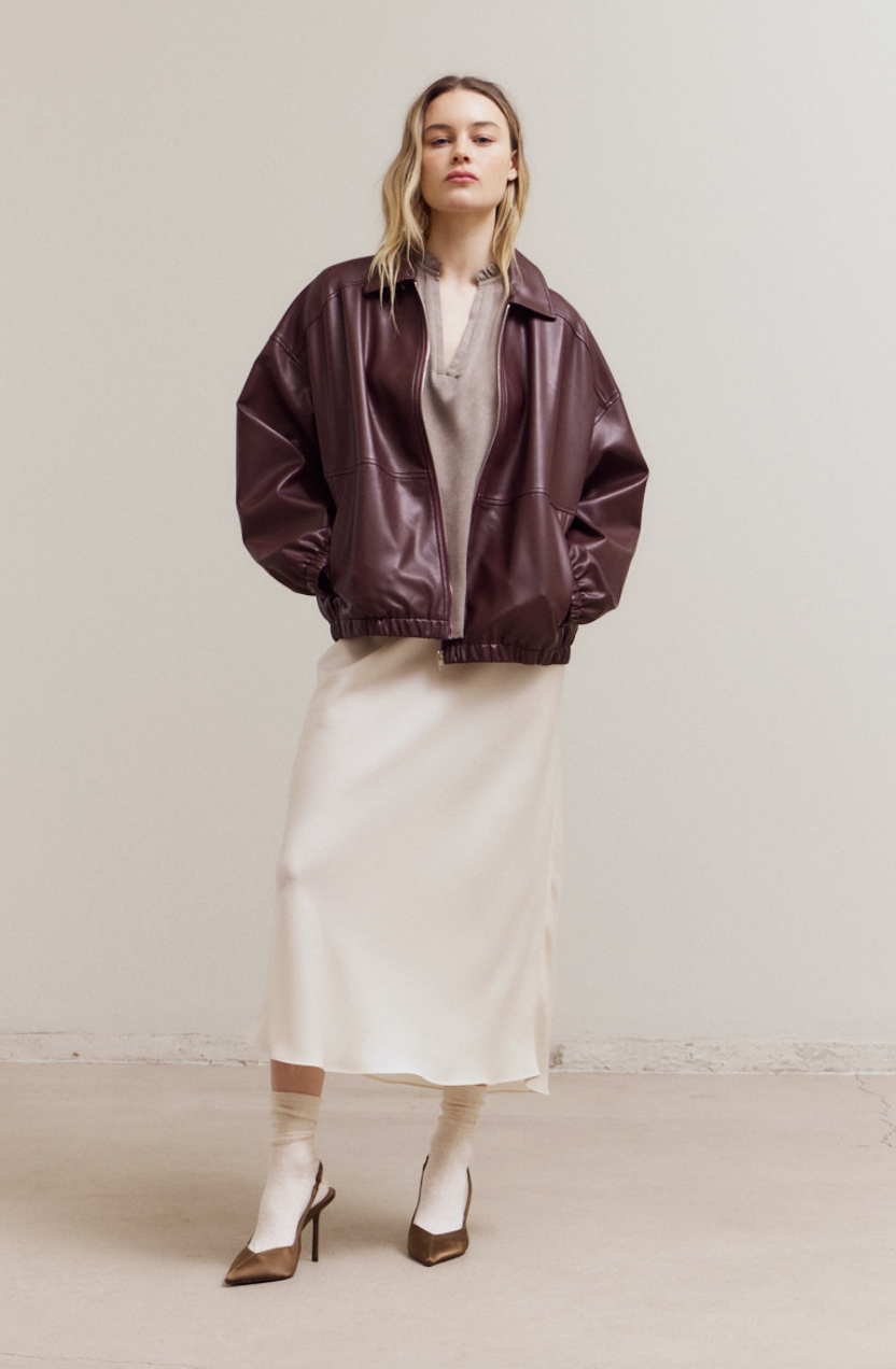 The Vegan Leather Bomber is an oversized lightweight jacket. We love the texture this piece brings to an outfit. It screams borrowed from your boyfriend/ vintage vibes.