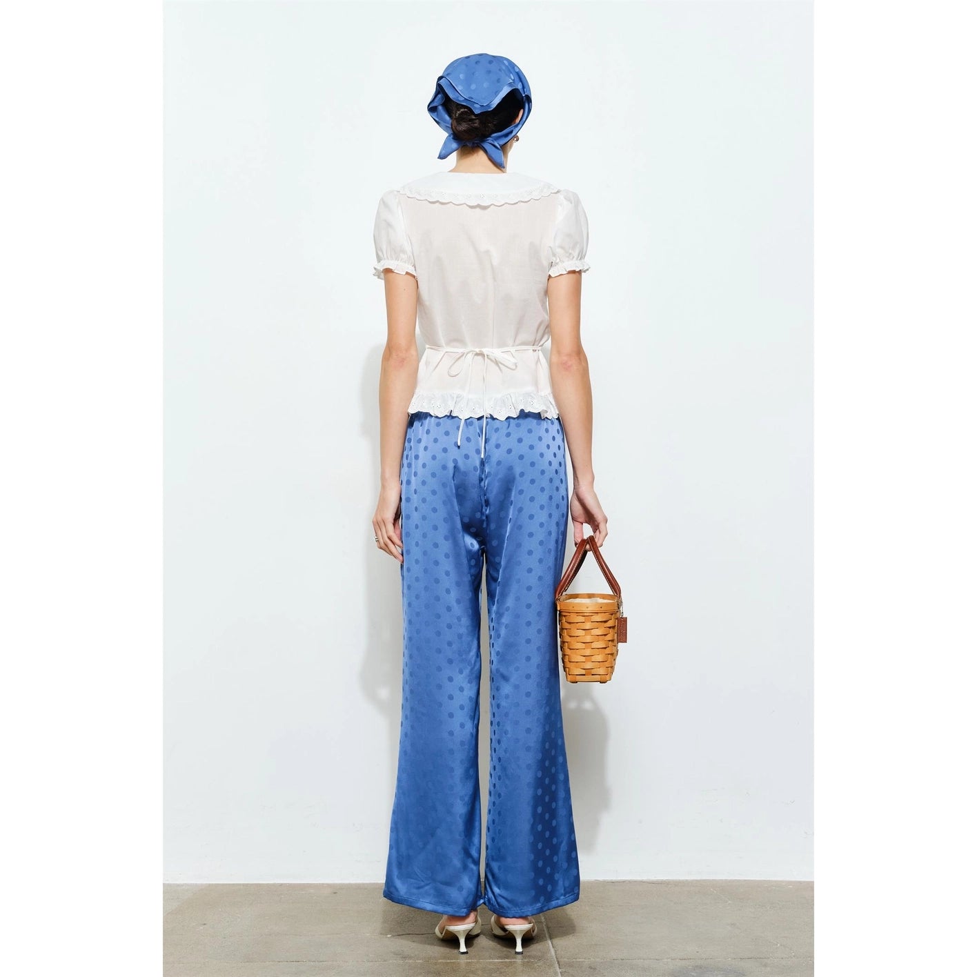 The Vivienne Pants & Scarf Set are a fluid satin jacquard in a tonal polka dot weave— giving these pants & scarf a quiet shimmer that catches light. The wide-leg silhouette falls from a gathered elastic waistband, draping long and clean through the hip. A self-tie drawstring bow at the front waist adds a feminine finish that reads both polished and effortless. Finish your look off with the matching scarf and a basic tee!