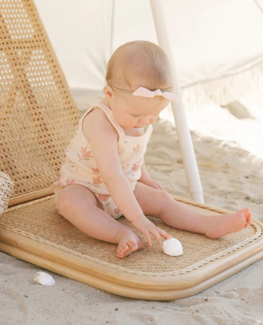 The Cinched Waffle Romper is a go-to for summer! Featuring spaghetti straps, a cinched waist, and bottom snaps to ensure easy changing.