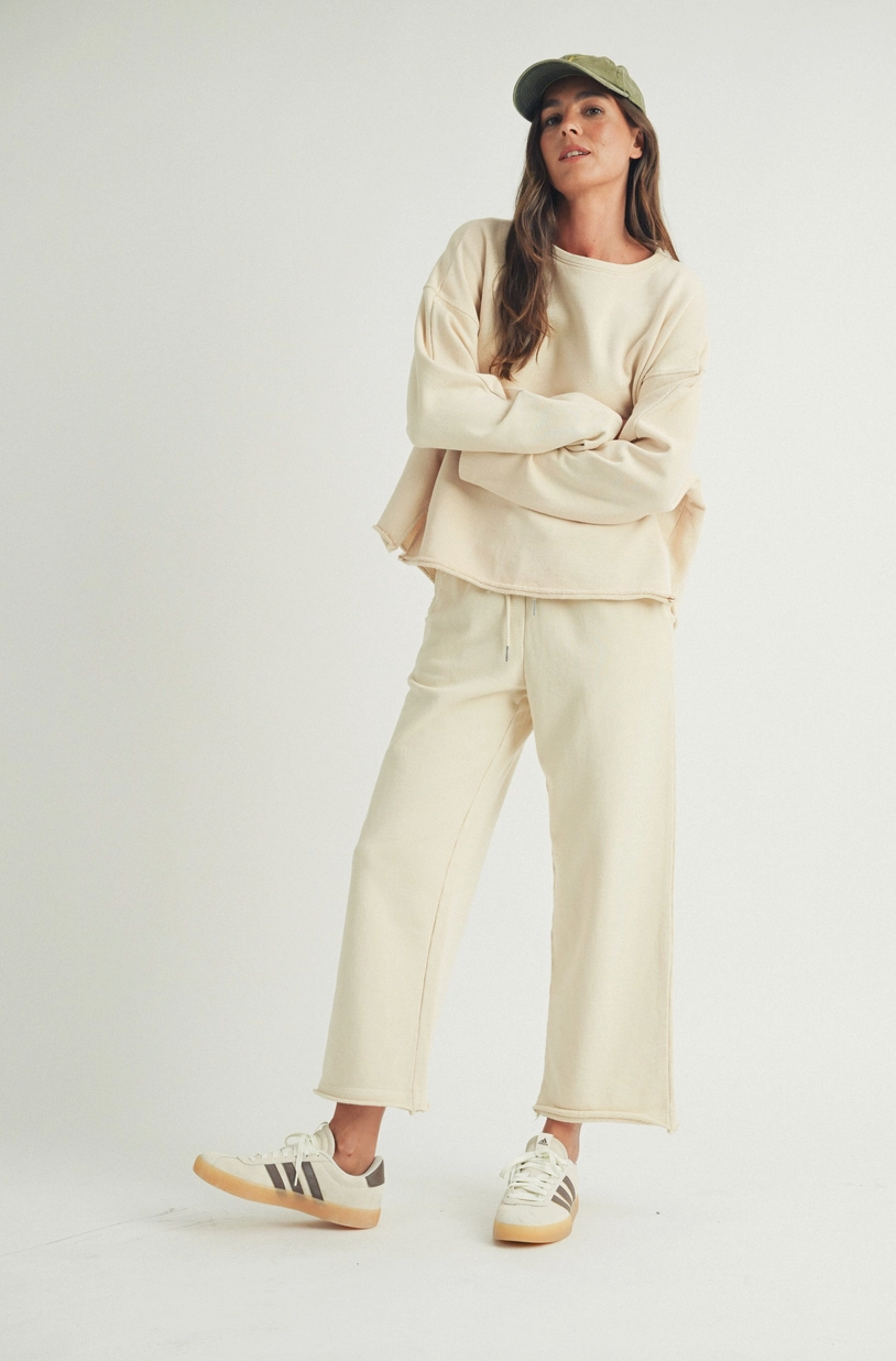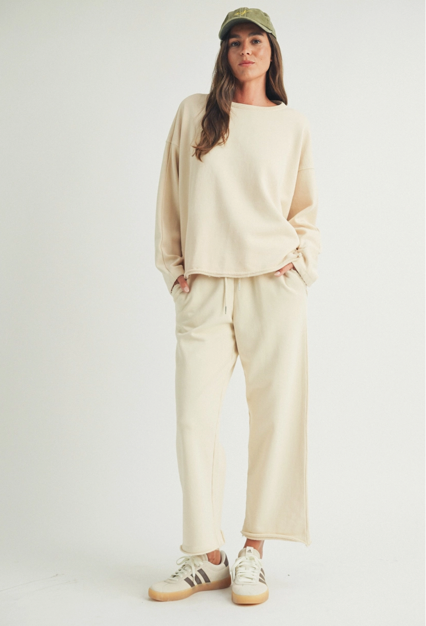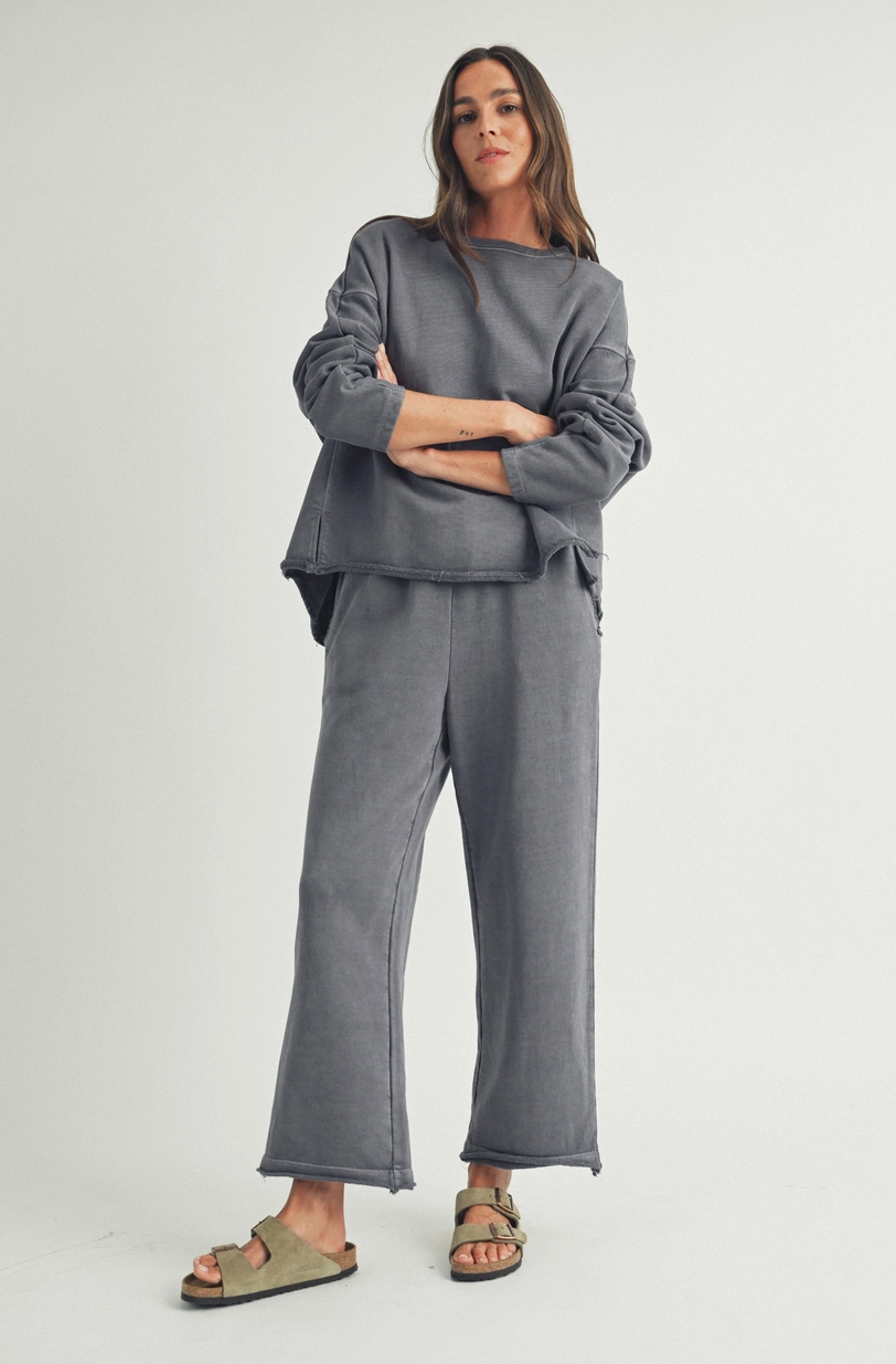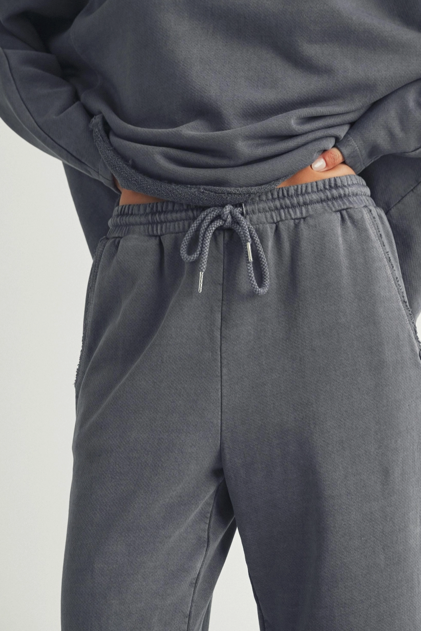 The Ami Wide Leg Lounge Pants have a full-length wide leg cut for a relaxed silhouette, and an elastic waistband with adjustable drawstring tie. These pants feature a soft washed finish for an ultra-comfy feel. The raw hem detailing adds a laid-back touch. Perfect for lounging, errands, or casual everyday wear. Pair with the matching top for a cute set.