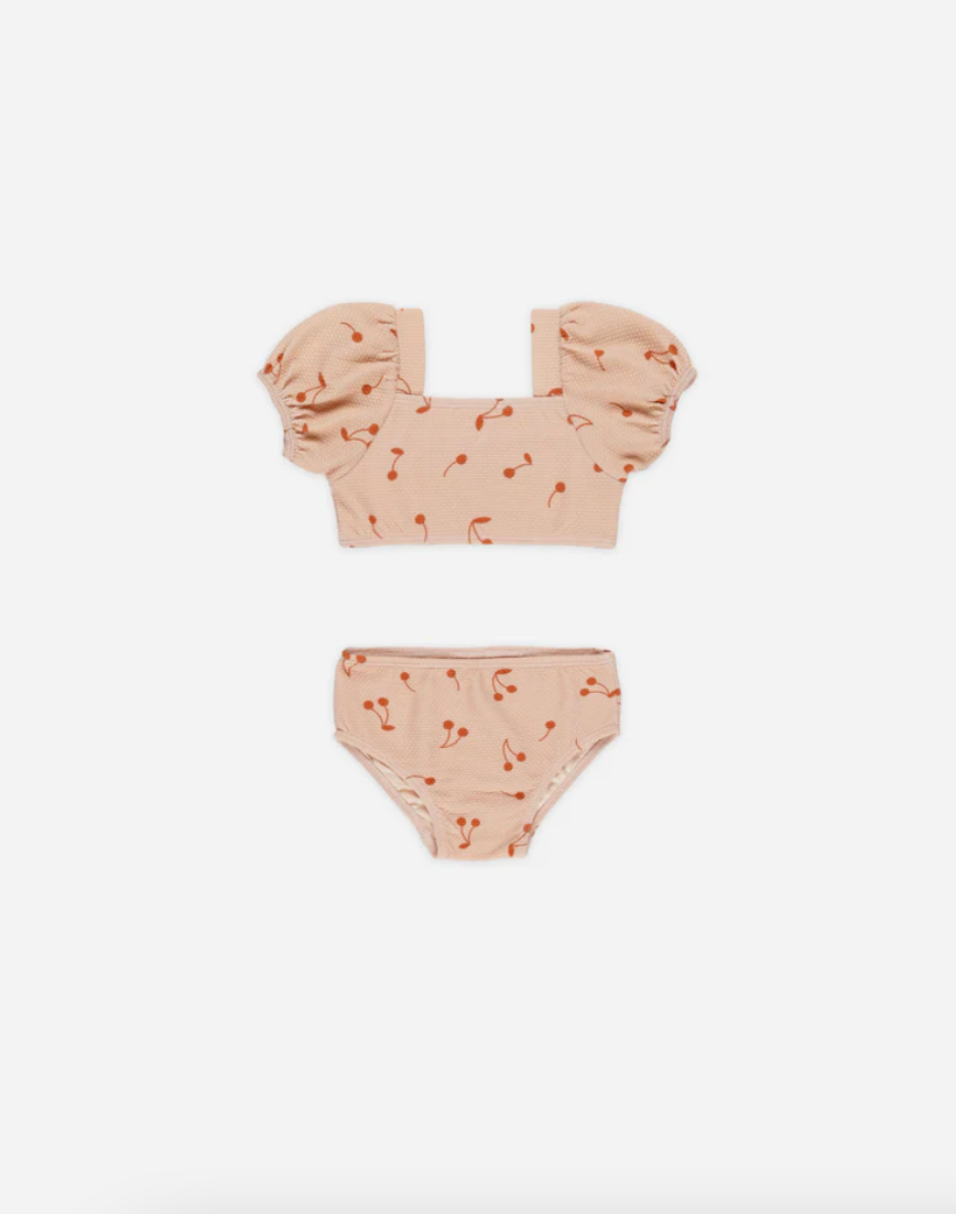 Two-piece bathing suit featuring puff sleeves and a square neck.