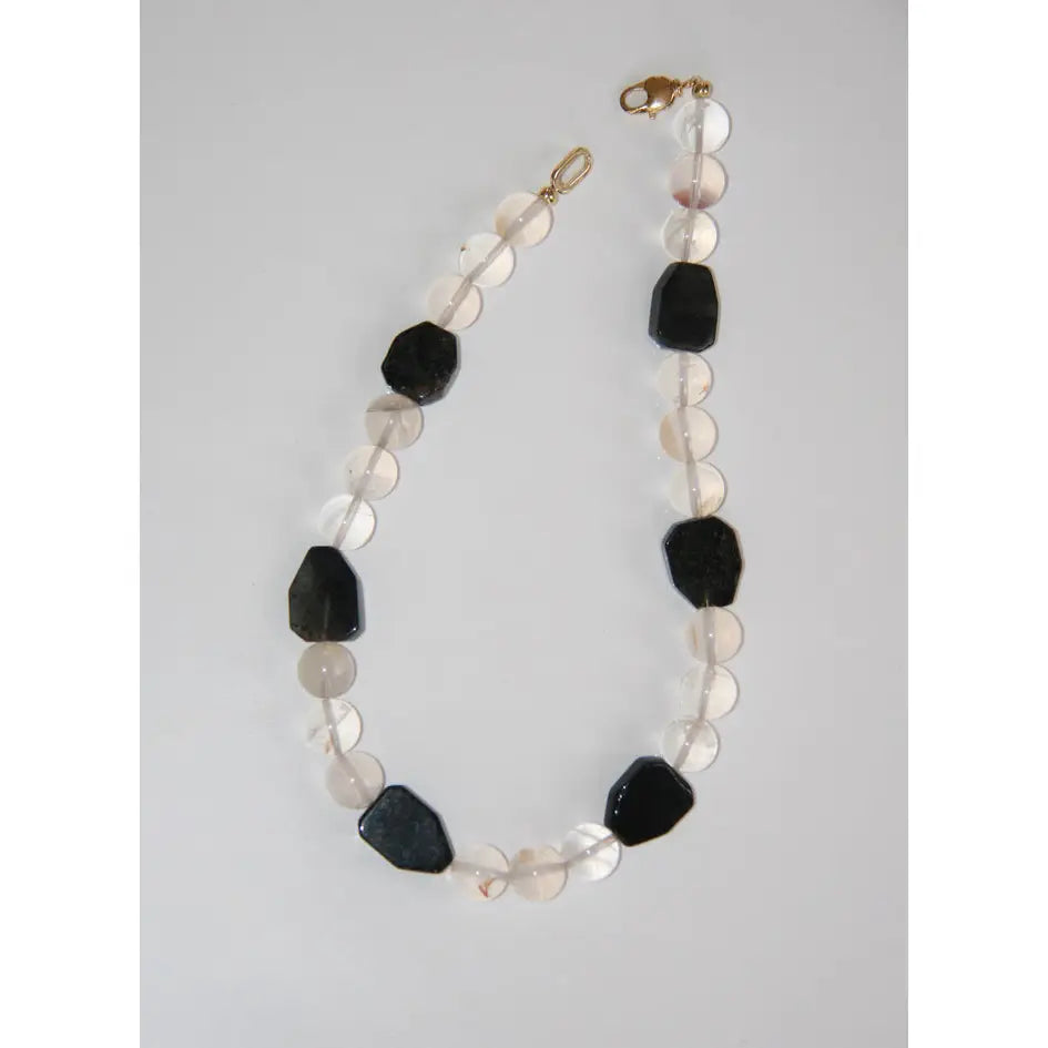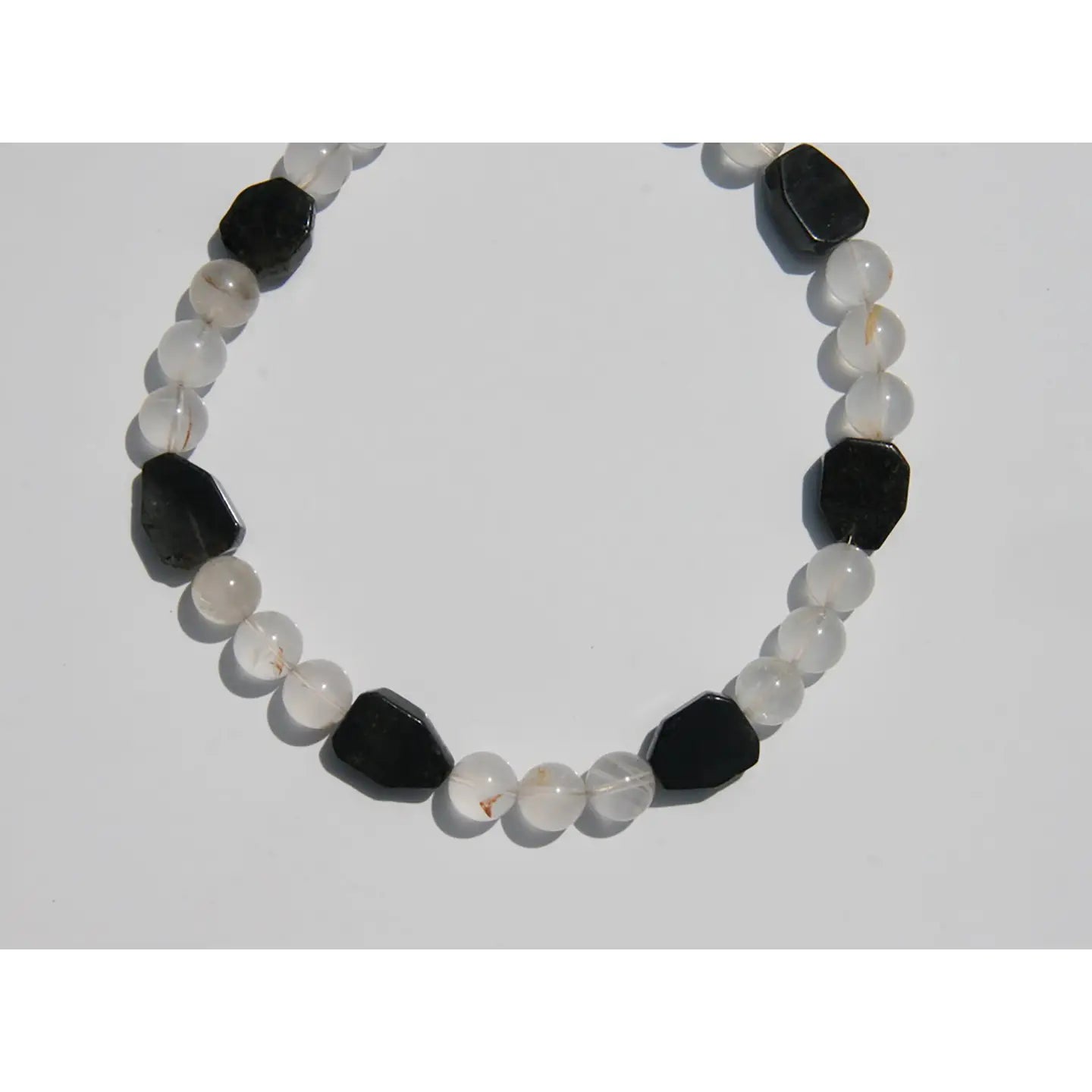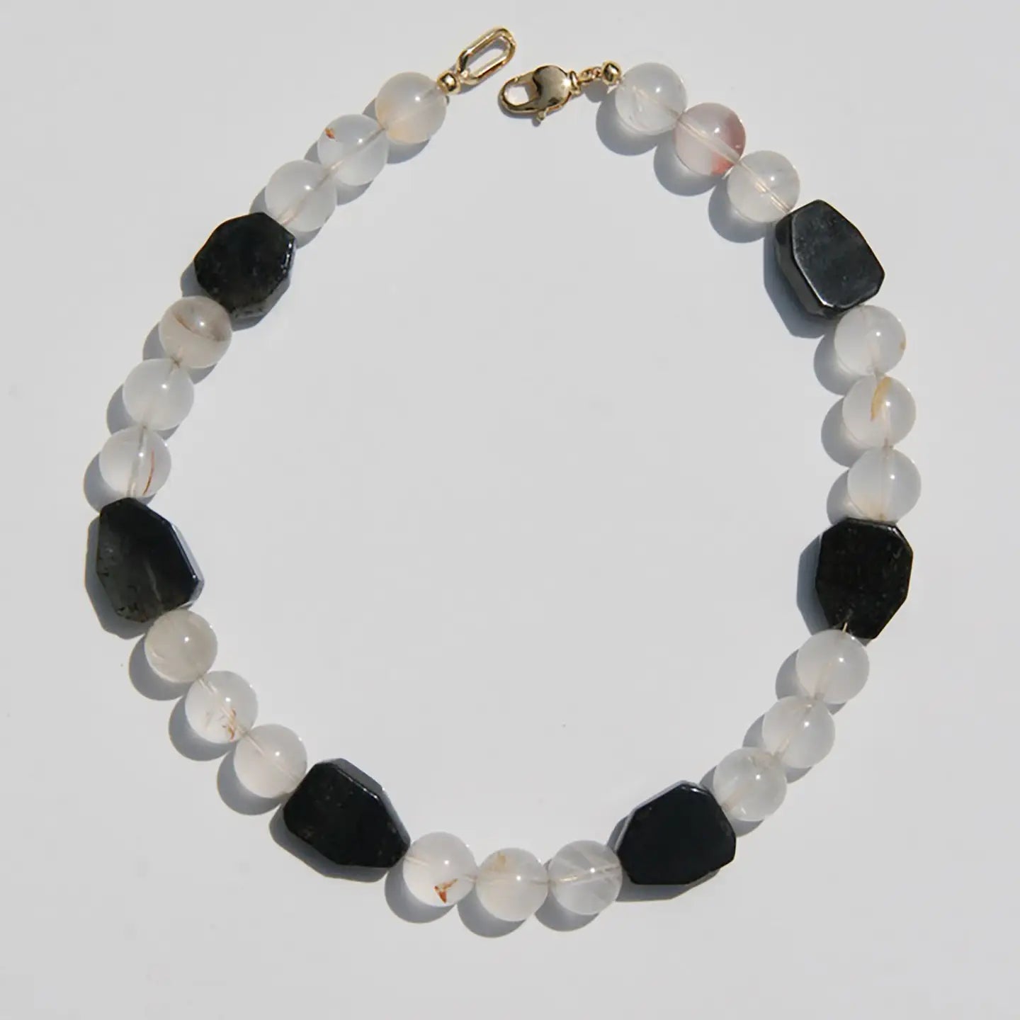 A neutral palette beaded necklace. With an alternating pattern of smooth round rutilated clear quartz beads and hexagonal black tourmaline, this piece is both subtle and statement.